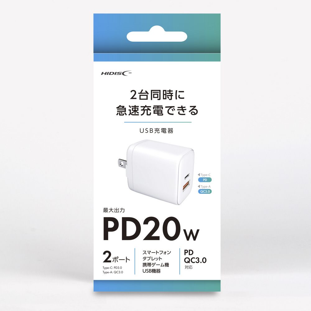 HIDISC 2台同時に急速充電できるUSB充電器 USB-C x1 Ax1 ポート HD-AC2P20WH HIDISC HD-AC2P20WH [2ポート /USB Power Delivery対応]