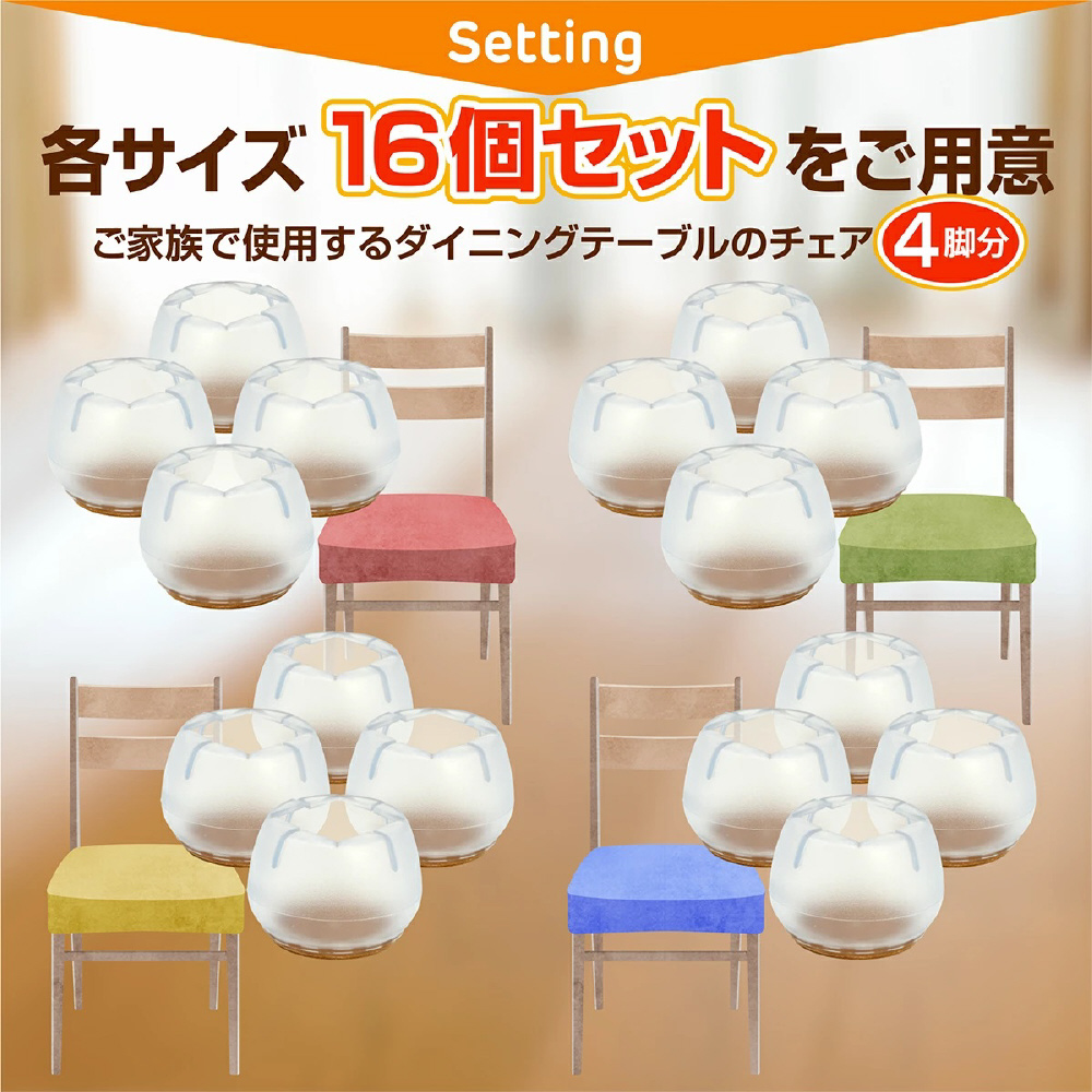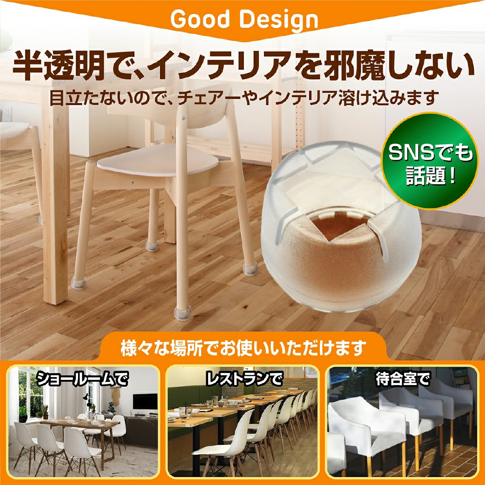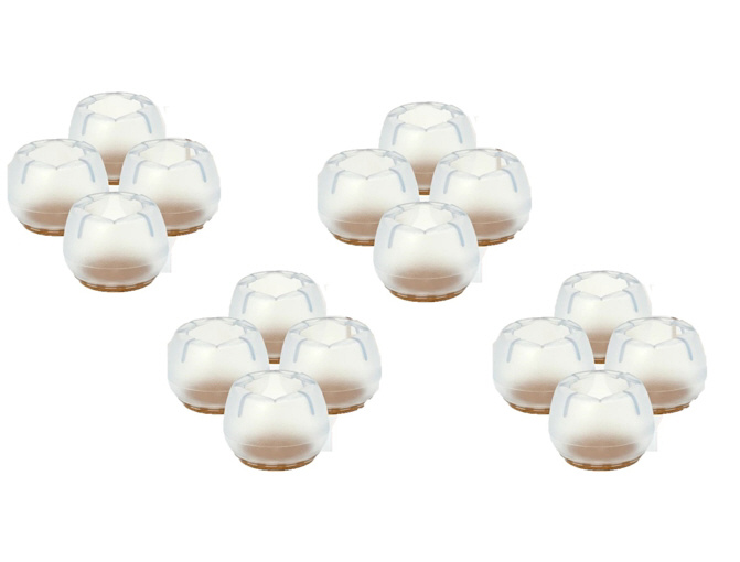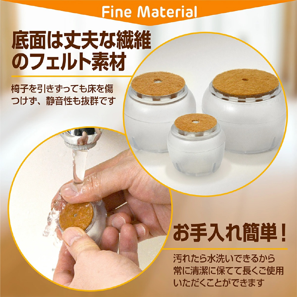 伸縮性、耐久性に優れた半透明のシリコンキャップを使用しており、とても柔軟性があるため様々な形と互換性があります。底は防音性と磨耗性を備えるフェルトで、椅子とテーブルを移動している時に騒音と摩擦を減少することができます。