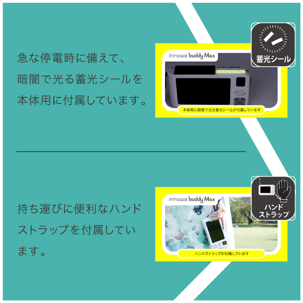 停電時に備えて、暗闇で光る本体用蓄光シールや持ち運びやすくなるストラップを付属しています。