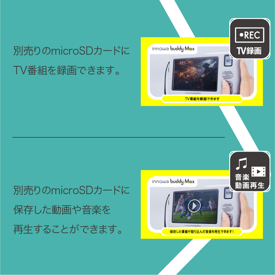 別売microSDカードを利用すれば、テレビ番組の録画・再生、パソコンから取り込んだ動画・音楽・画像の再生を行うことができます。