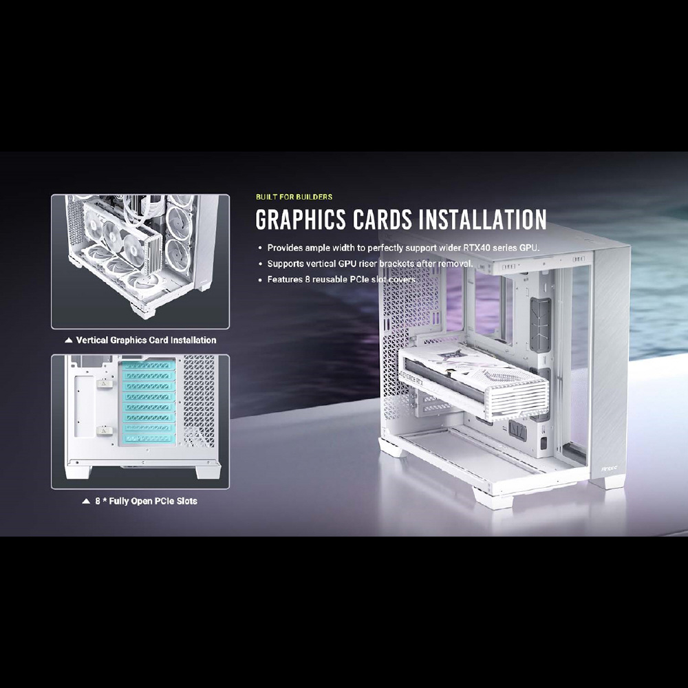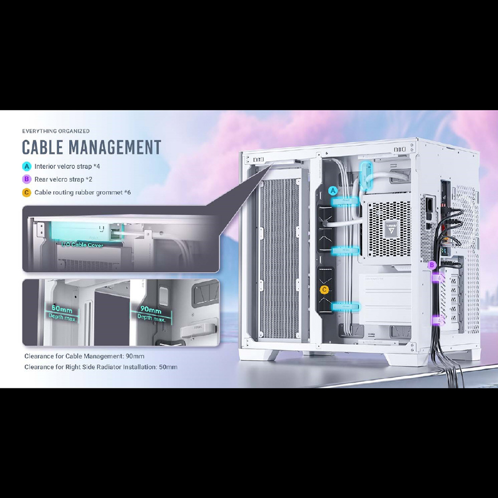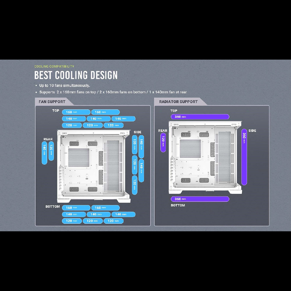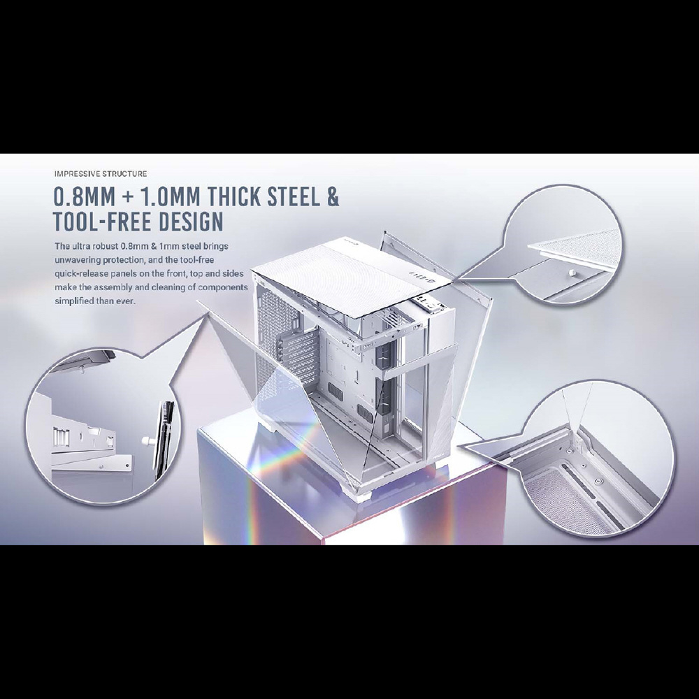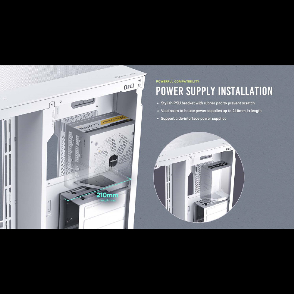 Constellation C8 Aluminum Whiteは、フロントとサイドに強化ガラスパネルとアルミ製のフロントパネルを搭載し、右側はメッシュのスチールパネルを搭載したE-ATXマザーボード対応のフルタワーPCケースです。最大120 mmファンを10基搭載することができ、左側の強化ガラスパネルは表面にネジ穴を設けないことで美観と耐久性を両立します。
