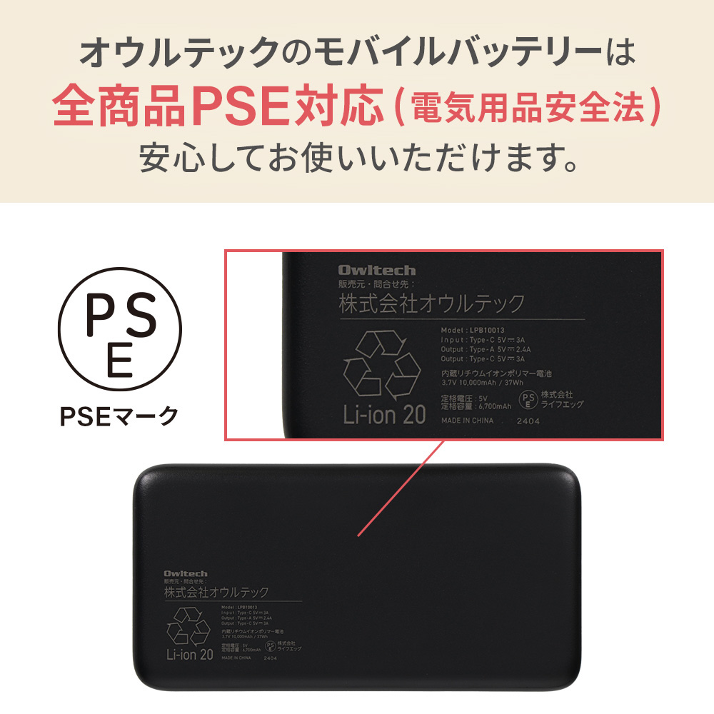 モバイルバッテリー 10000mAh USB Type-C入出力/USB Type-A出力 厚さ14.2mm 最大15W出力 ブラック OWL-LPB10013-BK 【864】