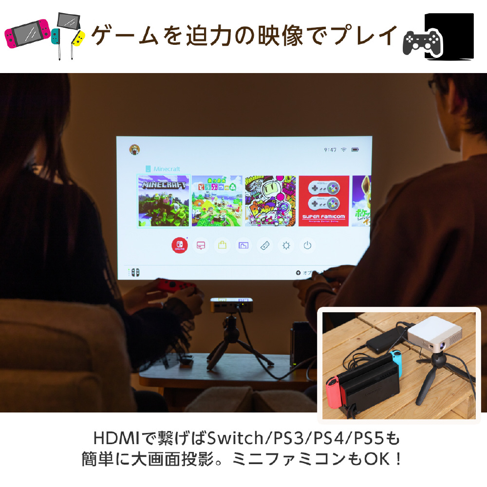 ゲーム機器やパソコンの画面を壁や天井に投影できます。Nintendo Switch(ニンテンドースイッチ)やPS3-5をつないで迫力の大画面でプレイ!