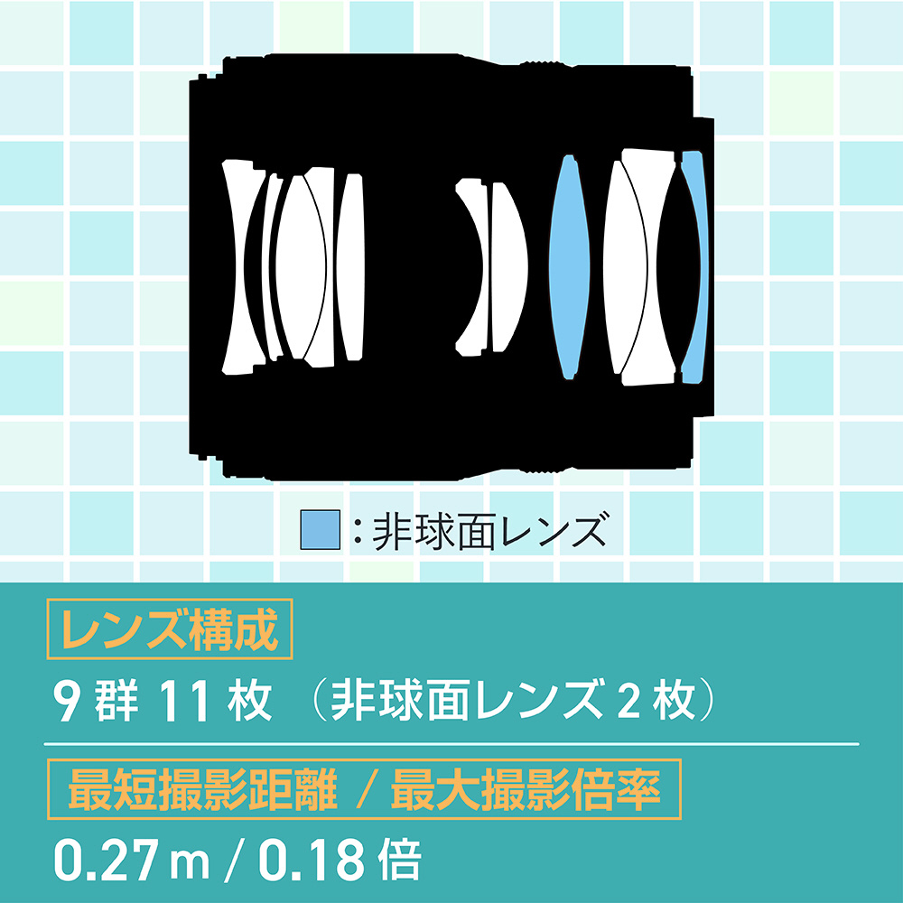 | レンズ構成 | 9群11枚(非球面レンズ2枚) |
