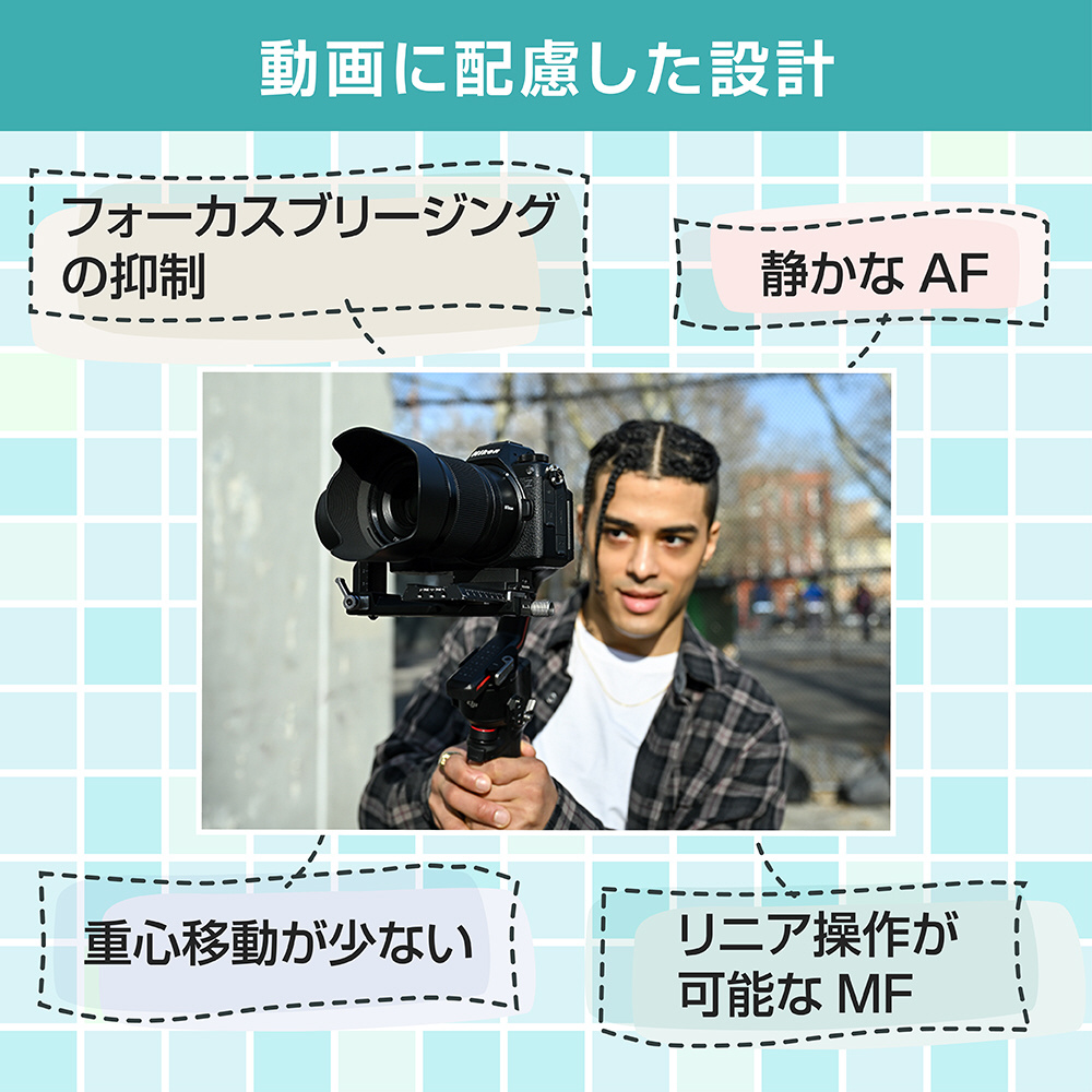 フォーカスブリージングを効果的に抑制※しているため、ピント位置を変更しても自然な映像が得られます。さらに、STM(ステッピングモーター)による静粛なAFを実現。静かな場所での動画撮影時も、レンズの駆動音や操作ノイズが記録されにくくなります。ジンバル装着時でも、重心移動が少なく、バランスを保ちやすいことも特長です。