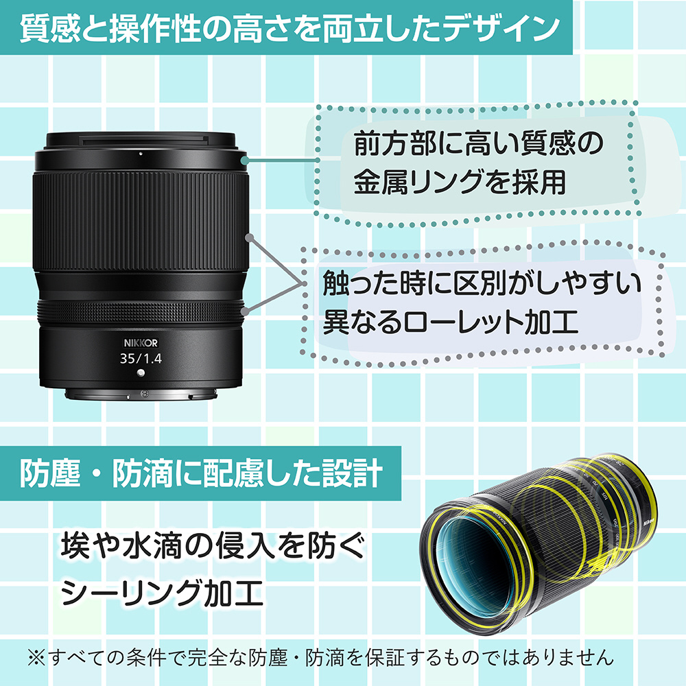 開放F 値1.4の明るいレンズでありながら、約415gの軽量モデル。バッグに入れてもかさばらず、お出かけの際に気軽に持ち出せます。さらに、防塵・防滴性能に配慮した設計※で、急に雨が降ってきても安心です。