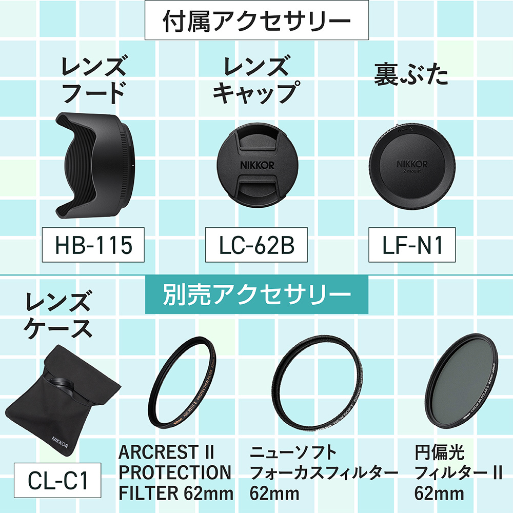 | 付属品 | レンズキャップLC-62B(スプリング式)、裏ぶたLF-N1、レンズフードHB-115 |