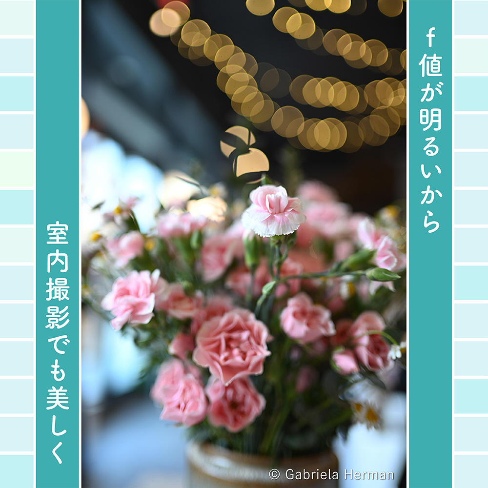 開放F値1.4だからこそ得られる大きなボケを活かして、被写体を立体的に際立たせることができます。最短撮影距離は0.27mと短く、被写体に近づくことで、背景を柔らかくぼかした印象的な写真が撮れます。また、明るいレンズなので薄暗いシーンでも速いシャッタースピード・低いISO感度で適正露出が得やすく、被写体ブレやノイズの少ないシャープな写真や動画を撮影できます。