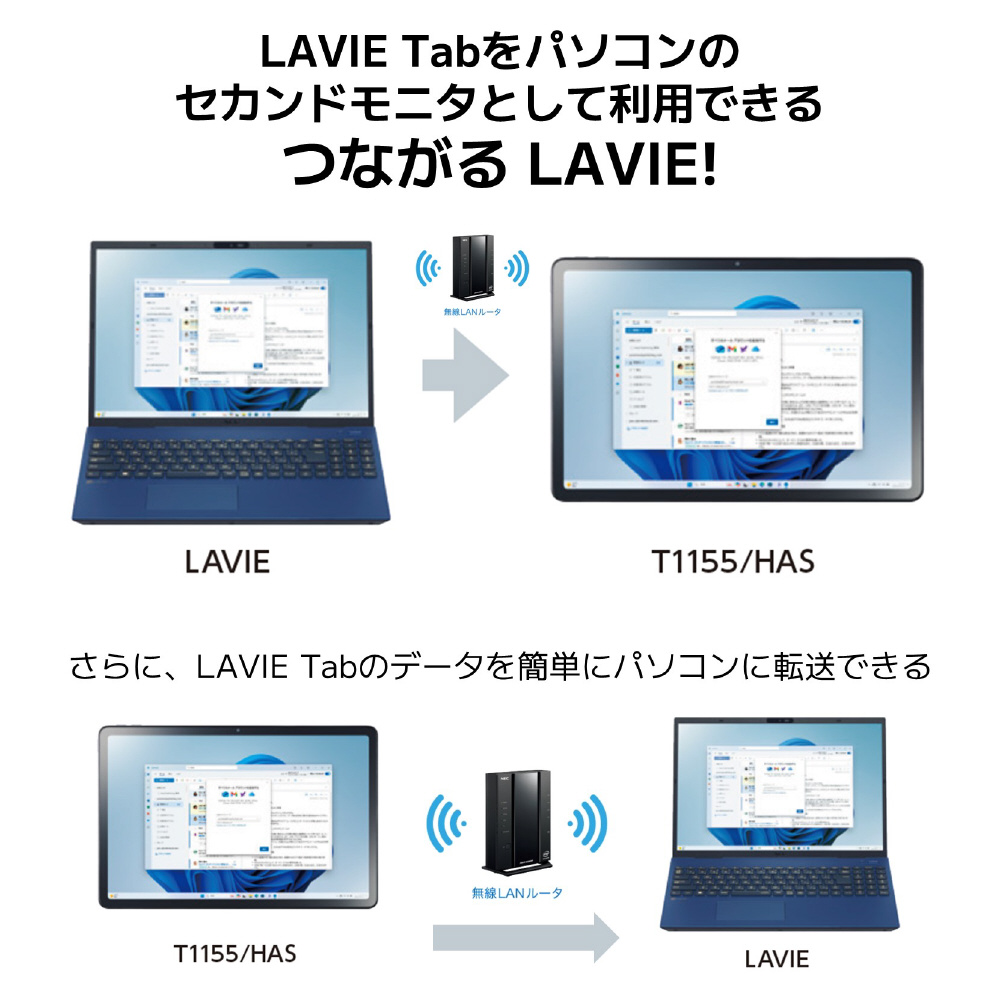 *:接続するパソコンと同じネットワークにつながっている必要があります。2022年1月以降発売のLAVIEと本商品の組み合わせで利用可能。なお、パソコンおよびAndroid タブレットのバックグラウンドで起動中のアプリ、ネットワークなどの利用環境によっては、表示や操作がスムーズでない場合があります。