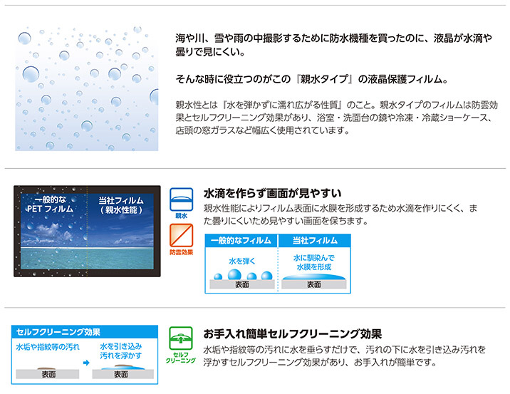 水に濡れても水滴を作りにくく画面が見やすい親水タイプのフィルム。