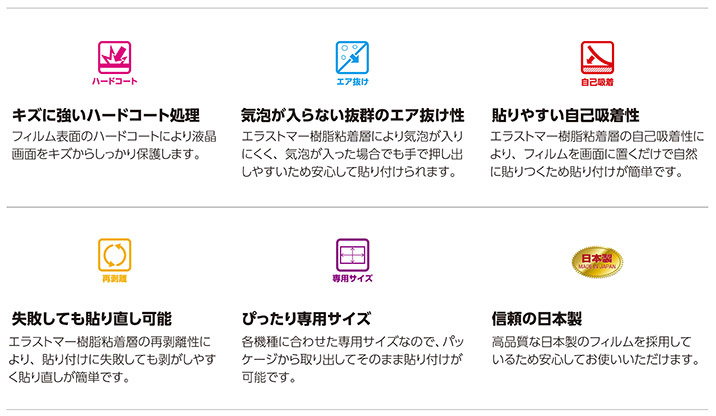 親水タイプ特有の防曇効果とセルフクリーニング効果を発揮します。キズに強いハードコート処理、エア抜け性抜群の粘着層を採用。