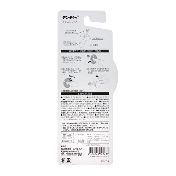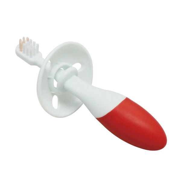 前歯が生え始める頃(6ヵ月〜)向けのベビー歯ブラシです。太いグリップでにぎりやすく、まるでお父さんやお母さんの指をにぎるような感覚で持つことができます。ブラシヘッドが「乳歯2本分」を目安にしたちょうどいいサイズ。のど突き事故を防ぐのど突きガード付き。