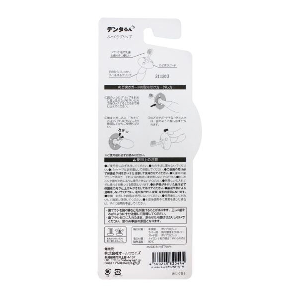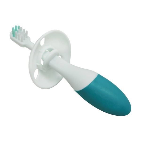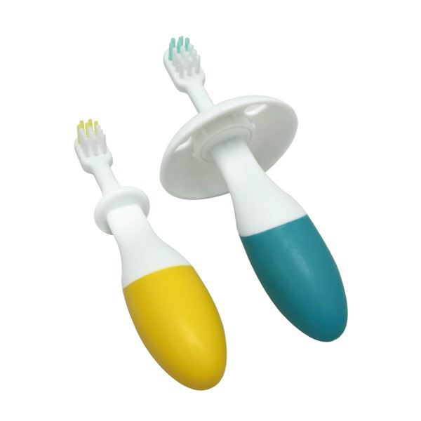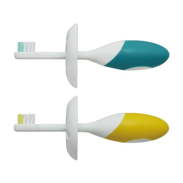 前歯が生え始める頃(6ヵ月〜)向けのベビー歯ブラシです。太いグリップでにぎりやすく、まるでお父さんやお母さんの指をにぎるような感覚で持つことができます。ブラシヘッドが「乳歯2本分」を目安にしたちょうどいいサイズ。のど突き事故を防ぐのど突きガード付き。