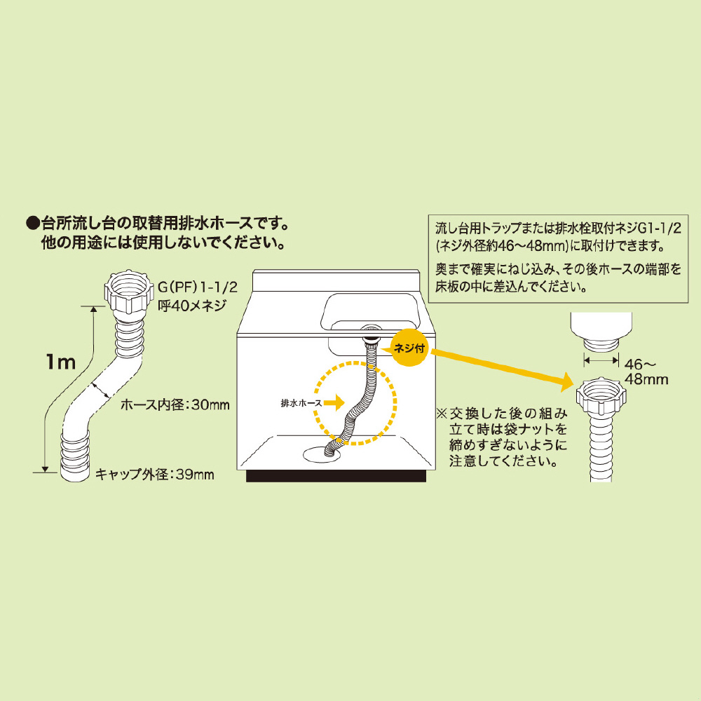 流し台用トラップまたは排水栓取付ネジG1-1/2(ネジ外径約46〜48mm)に取付けできます。奥まで確実にねじ込み、その後ホースの端部を床板の中に差込んでください。