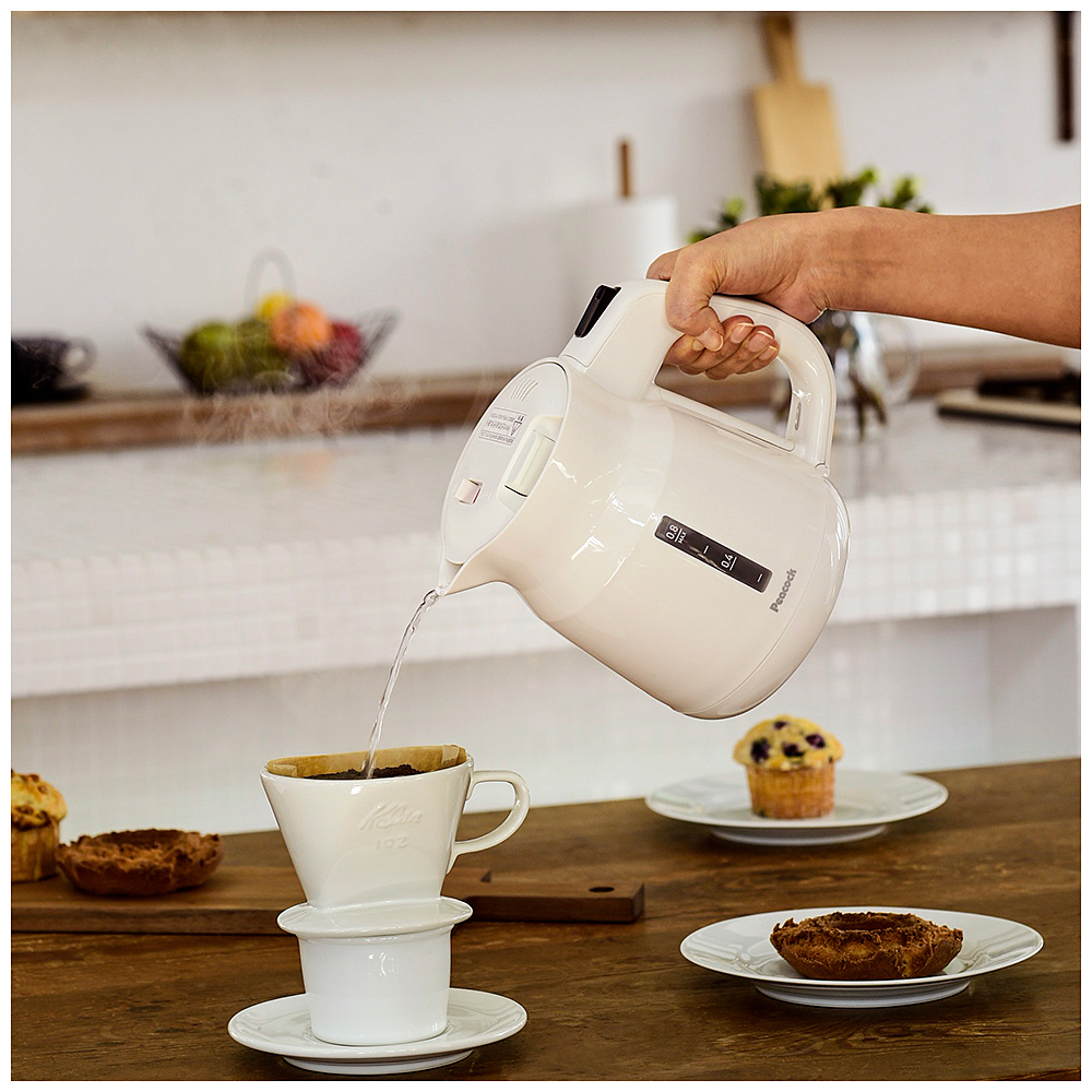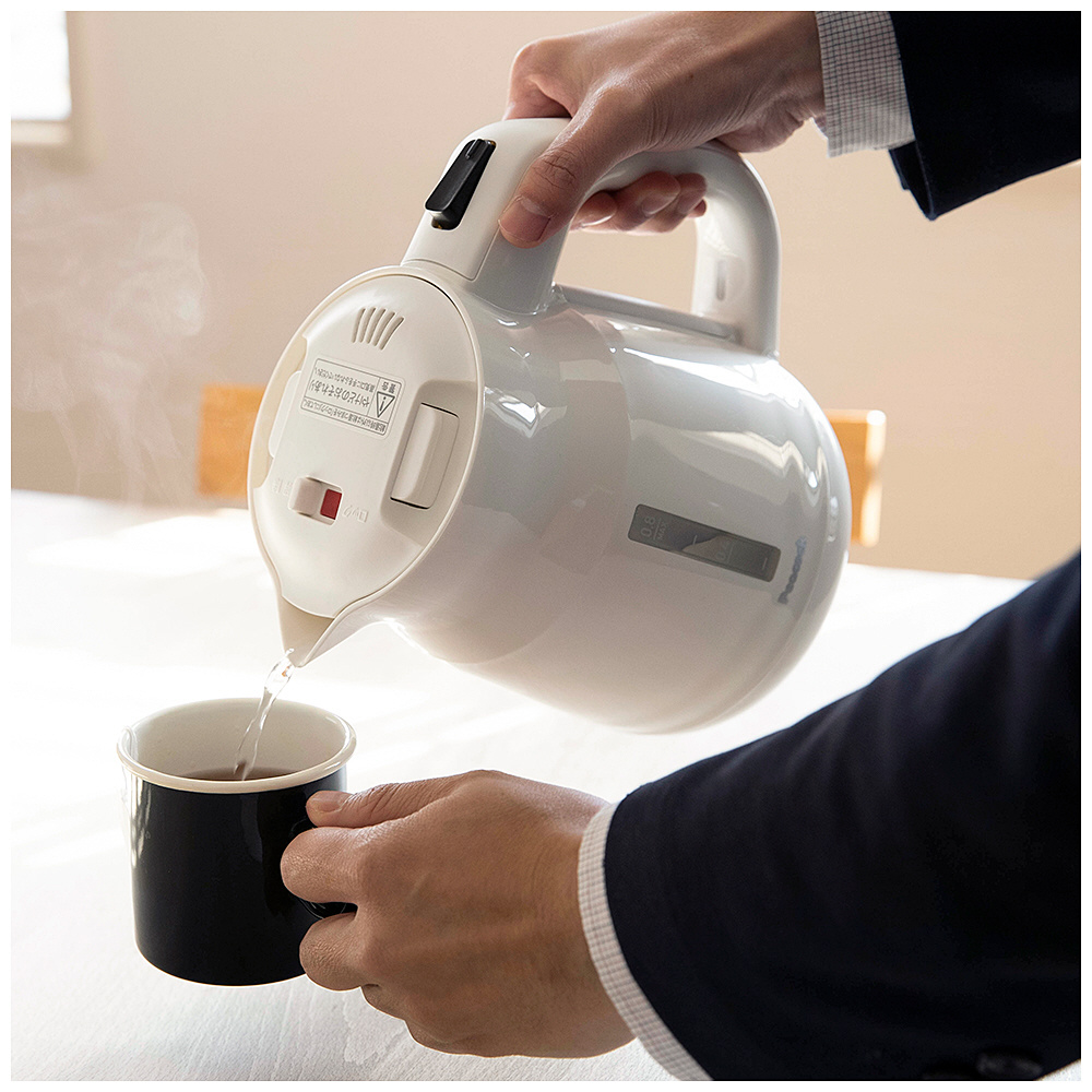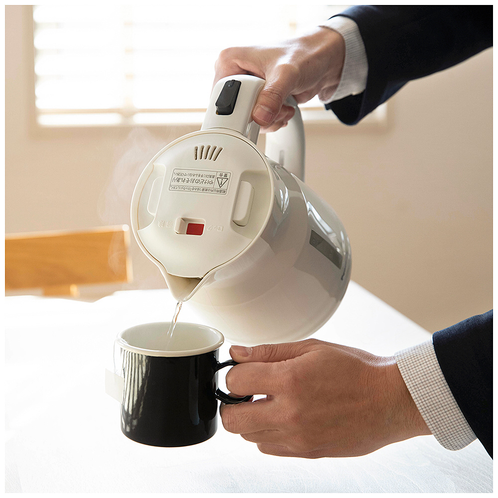 転倒湯漏れ防止、着脱式ふた、コードレス、空だき防止機能付き。
