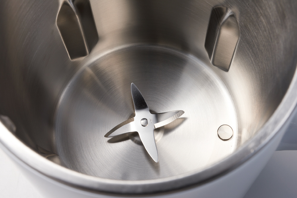 小さい大豆に合わせて設計されたステンレス製の4枚刃が毎分約15,000回の高速モーター搭載で大豆を液状まで粉砕
