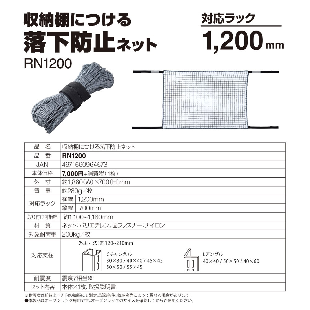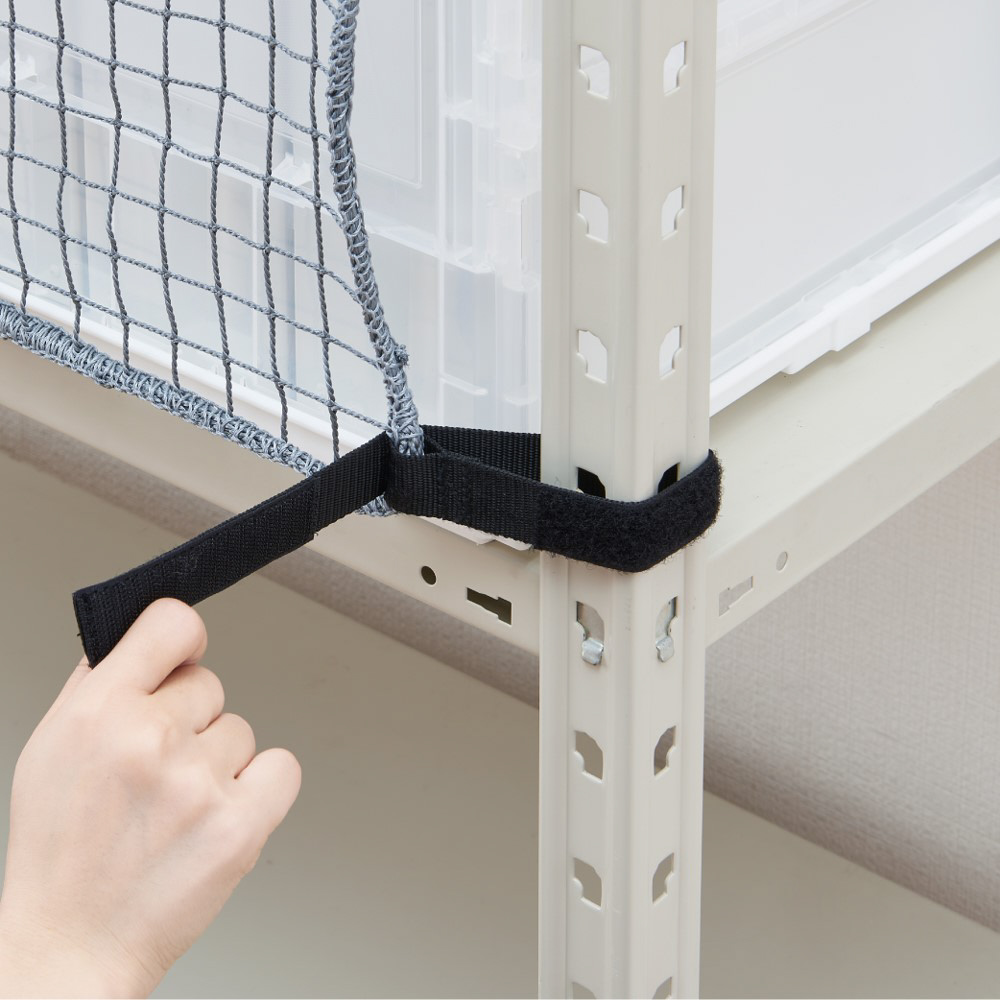 オープンラックに取り付けて震災時の収納物の落下を防止するネットです。収納物を面でカバーするため、収納物が大きくても、積み重なっていても、複数段でも落下を防止できます。頻繁には動かさない防災備蓄品、保管義務のある書類や貯蔵品の収蔵庫にもおすすめです。震度7相当に対応しています。