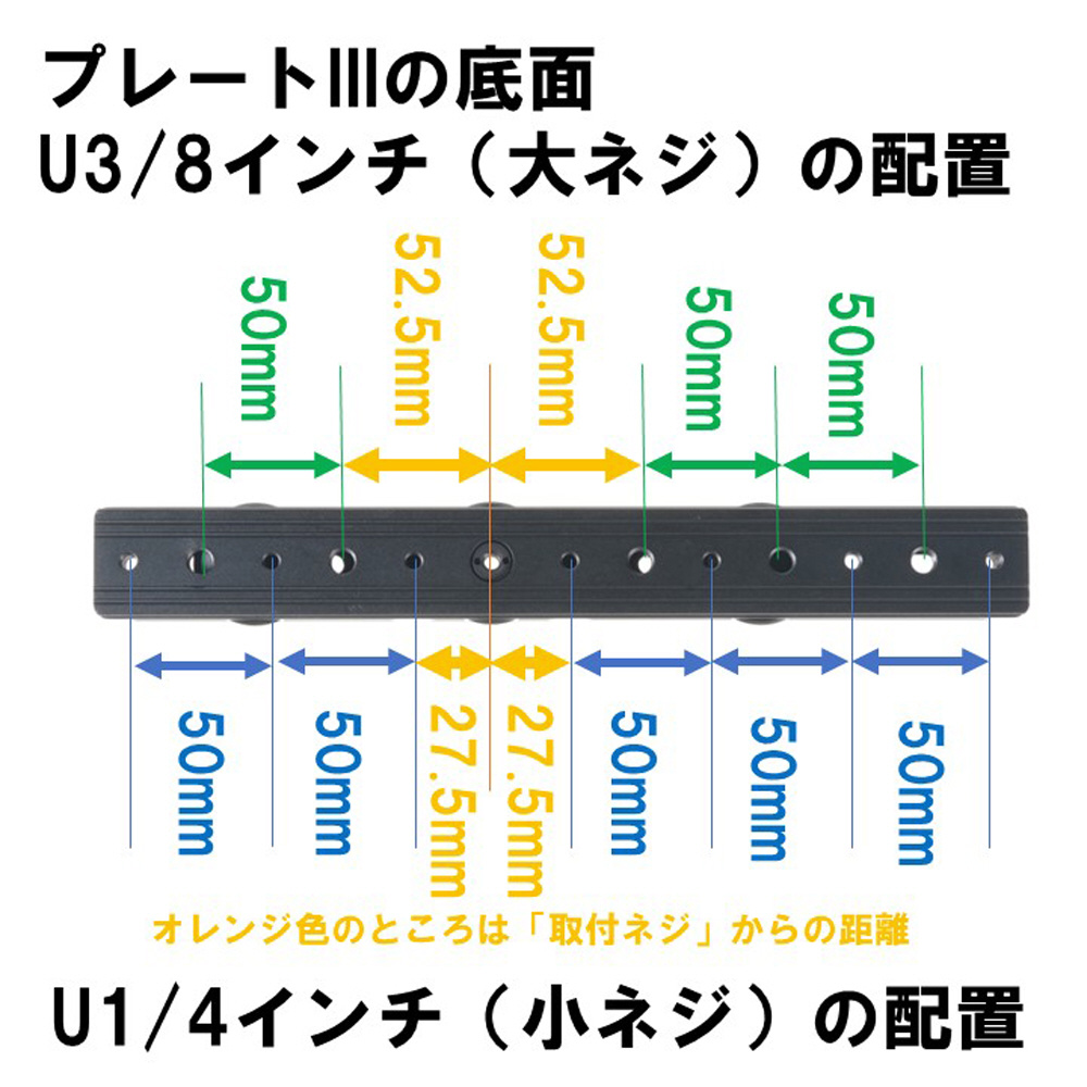 カメラ取付ネジはU1/4インチに対応しますが、底面にU1/4メスネジを7か所、U3/8インチメスネジを5か所備え、U3/8インチネジでの取付にも対応します。