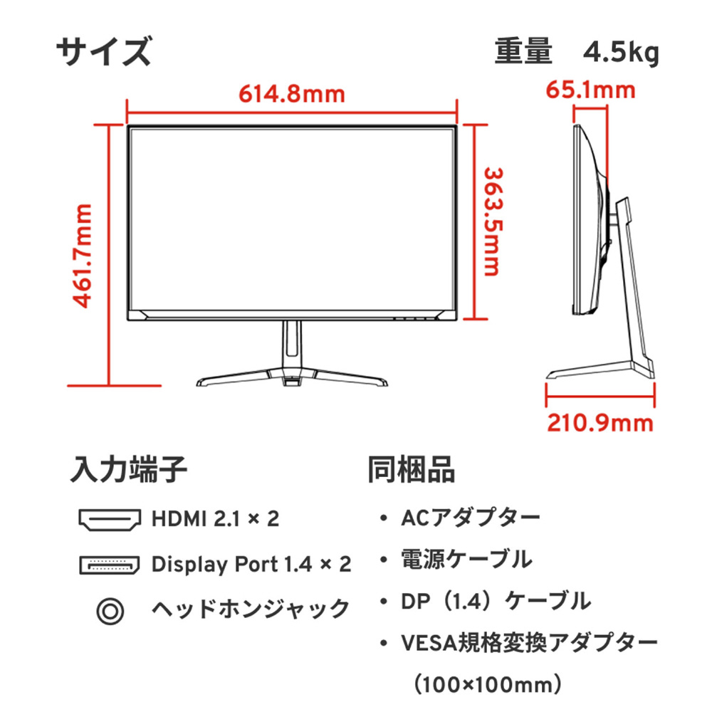 | 付属品 | スタンド Display Port (1.4)ケーブル 電源アダプター VESA規格変換アダプター(100x100mm) |