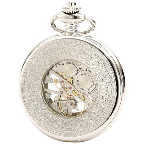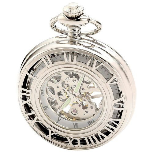 表側に蓋が付いたハンターケースタイプの懐中時計。裏側スケルトン仕様。取り外しが可能なチェーン付き。