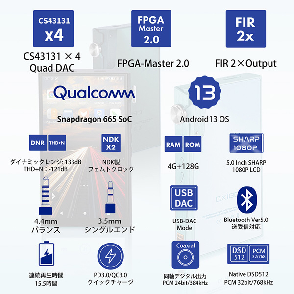 DX180はDX260と同じDACマトリックステクノロジーをベースに、4基の「CS43131」を搭載したクワッドDACアーキテクチャを採用しました。