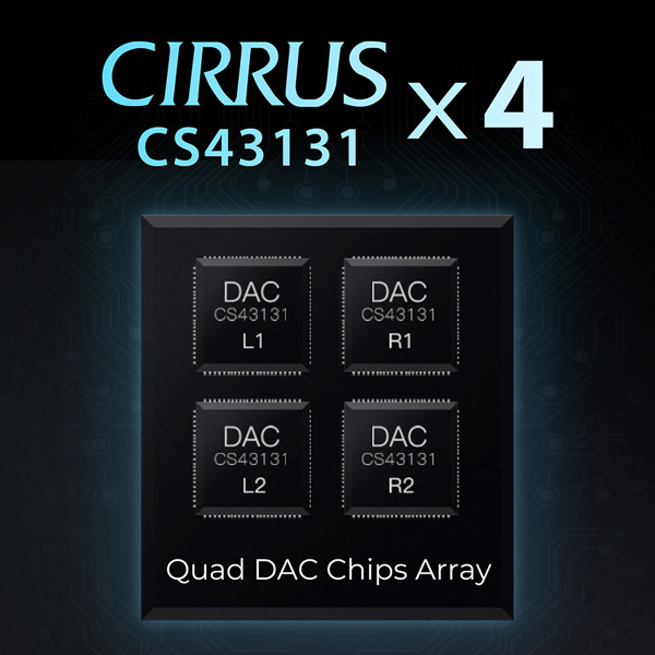 4基の「CS43131」がシンクロして駆動することで、ダイナミックレンジ:133dB、THD+N:-121dBというサウンドスペックを叶え、優れた技術と独自の設計コンセプトにより実現された、卓越したサウンドスペックです。