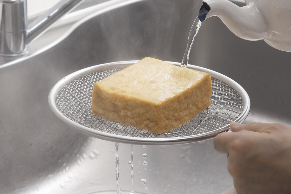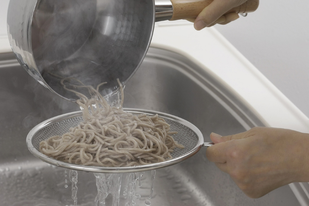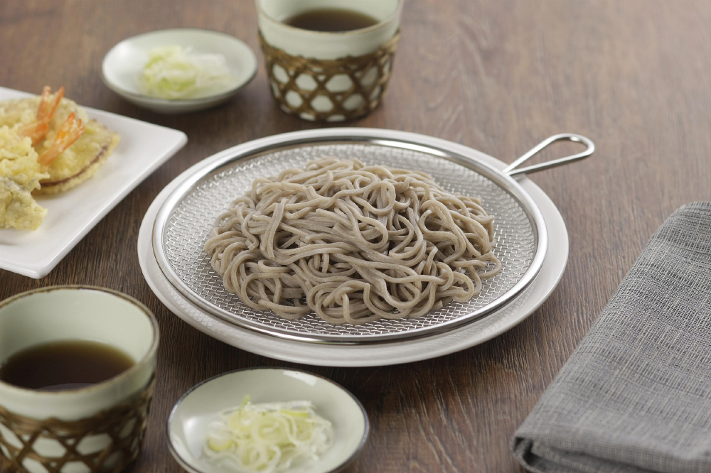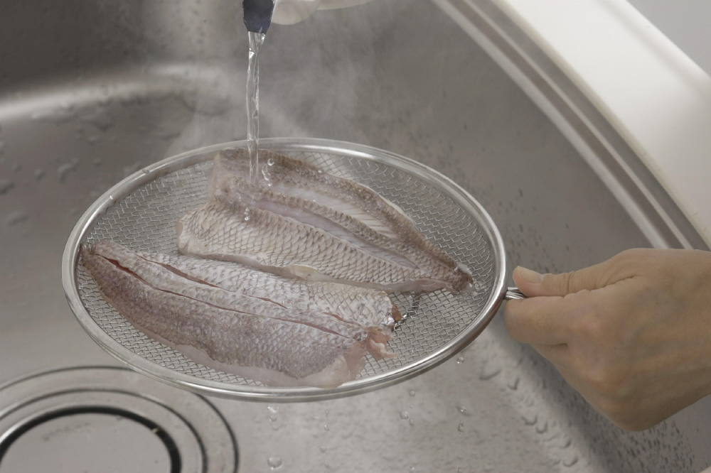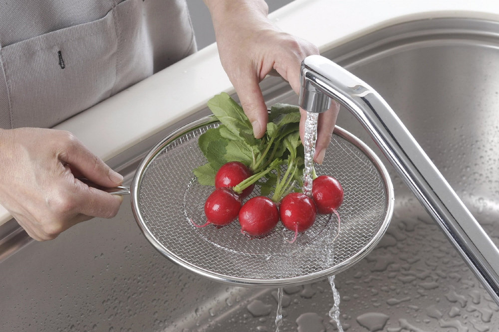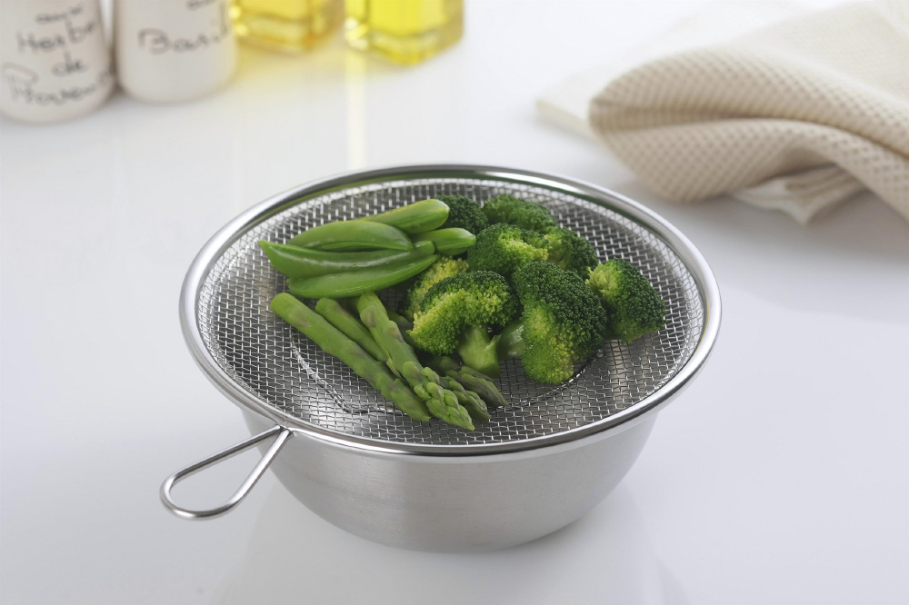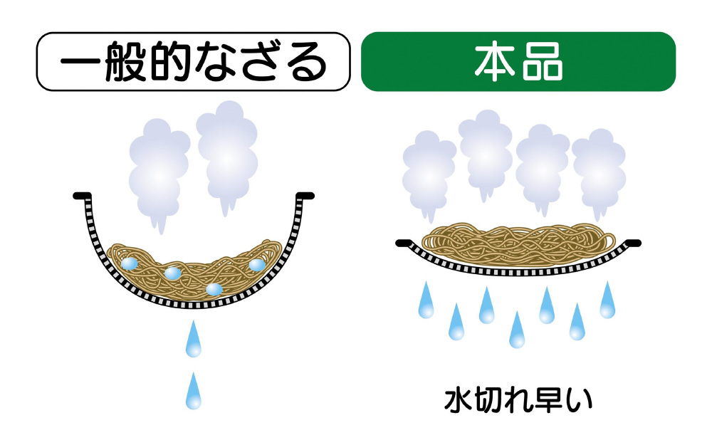 茹でた野菜の粗熱取りにも、蒸気がこもらないので、茹でた野菜が水っぽくなりにくい。持ち手付きで、湯切りや揚げ物の油抜き、魚の湯通しに便利。さらに、枝豆や冷水でしめた麺をのせたり、お鍋のときは豆腐や糸こん、野菜などをのせて。揚げ物の油切りにも使えます。