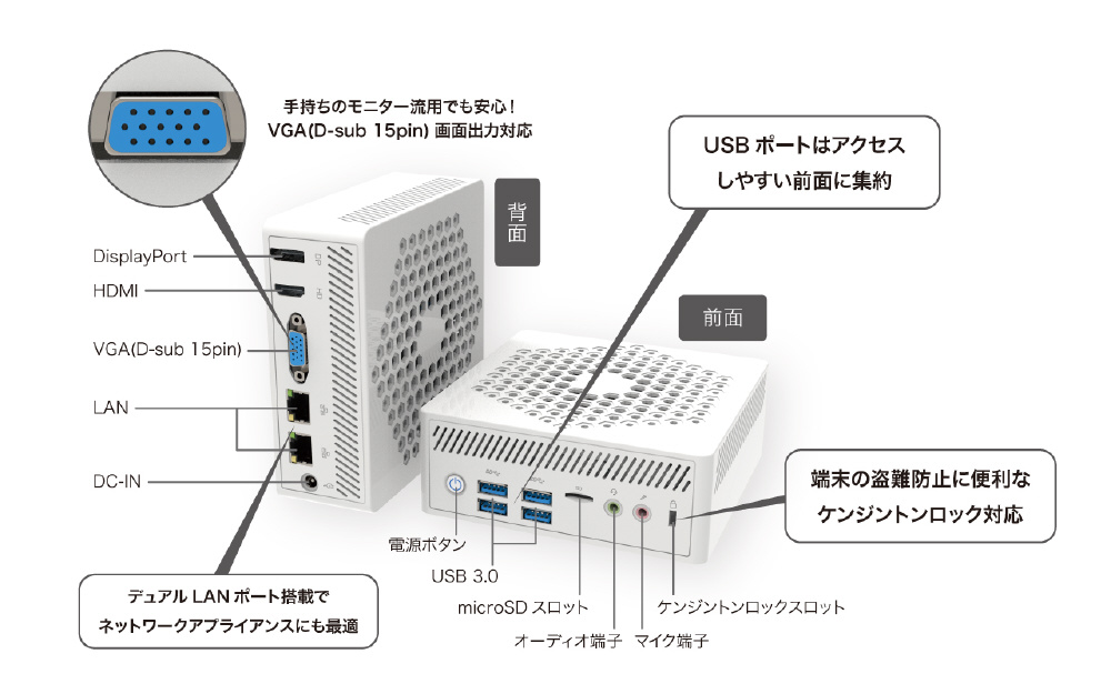 LN100Wは、Intel Processor N100を搭載した高性能ファンレスミニPCです。4コア4スレッド、最大3.4 GHz動作の高性能CPUと8 GBの大容量メインメモリ、256 GBのM.2 SATA 高速SSDを搭載しています。リモートワークやオフィス用PCの省スペース化、受付など来客がある場所の業務端末などに最適です。