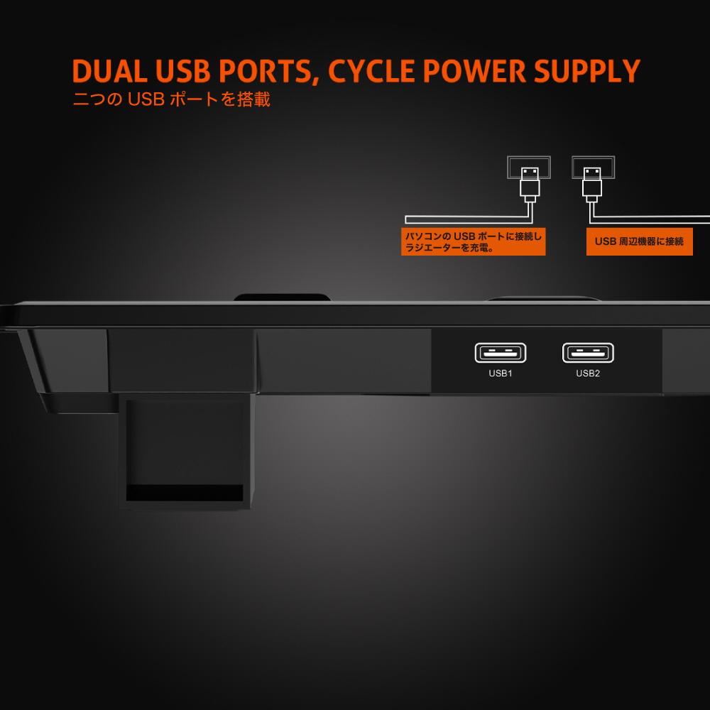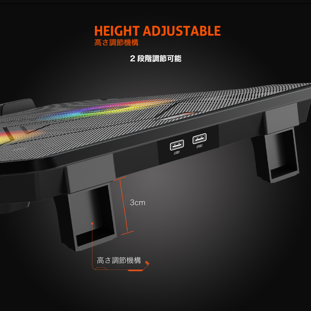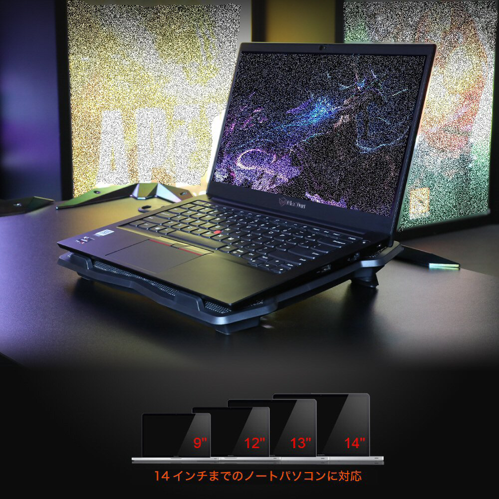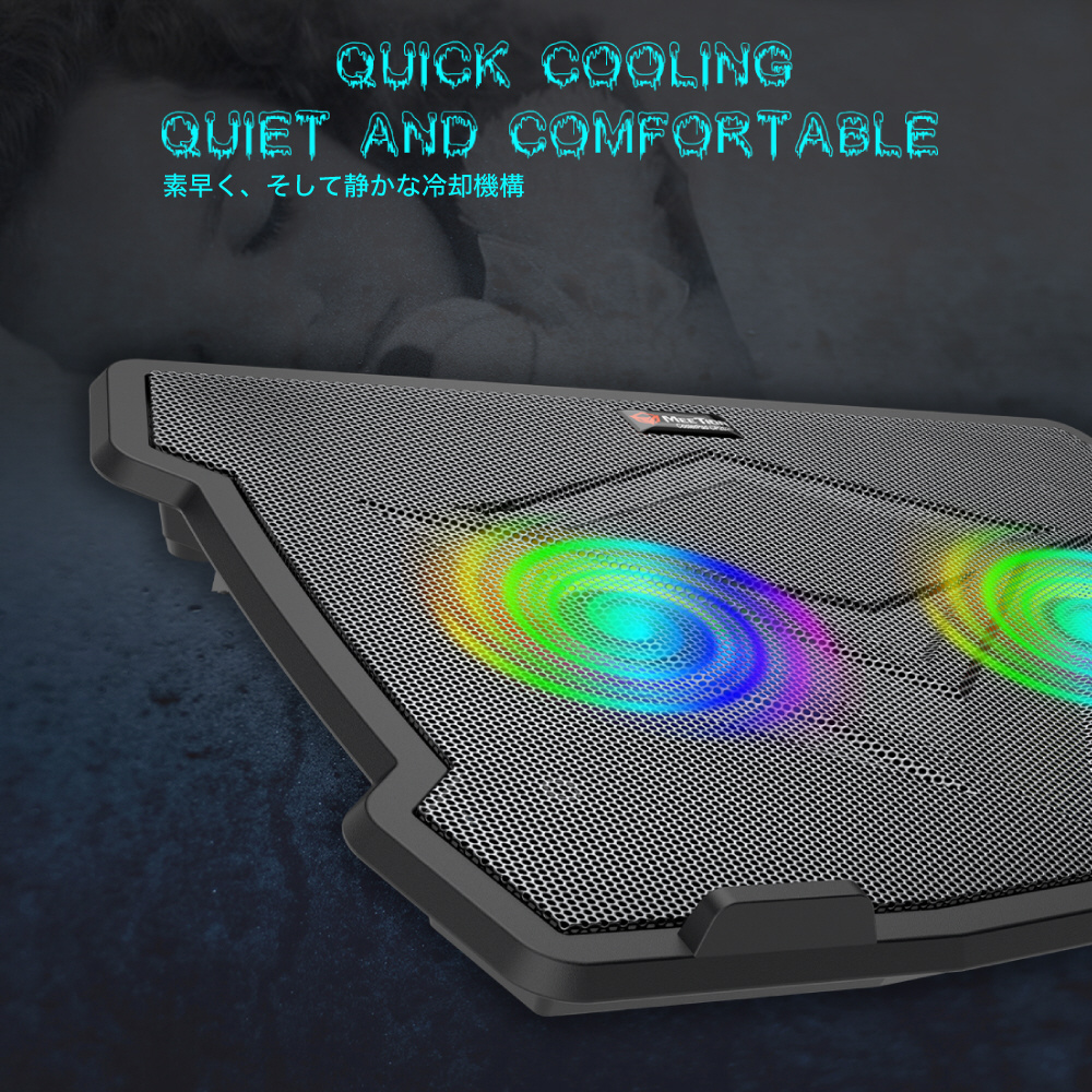 ノートパソコン用のクーラースタンド。直径110mmのファン2基搭載、速い冷却速度と低ノイズを実現。パソコンの熱を効果的に軽減し、ゲームや仕事をよりスムーズにします。また、LEDバックライトを採用しており、雰囲気を強調します。