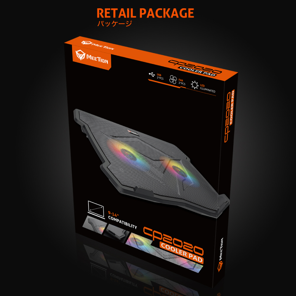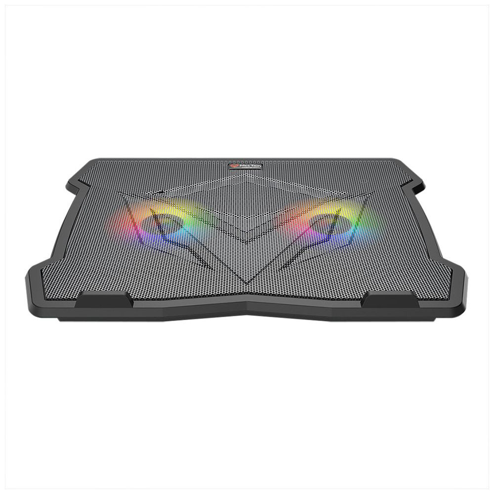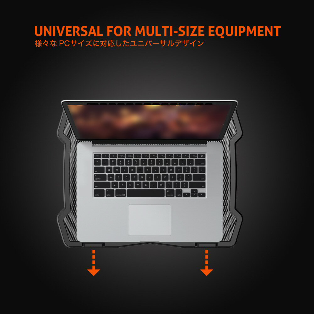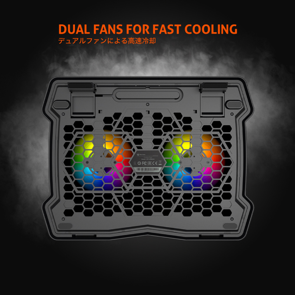 ノートパソコン用のクーラースタンド。直径110mmのファン2基搭載、速い冷却速度と低ノイズを実現。パソコンの熱を効果的に軽減し、ゲームや仕事をよりスムーズにします。また、LEDバックライトを採用しており、雰囲気を強調します。