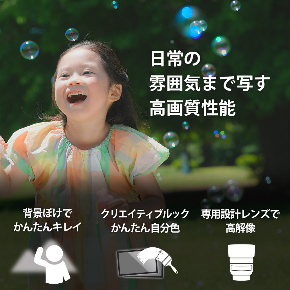 撮るだけ、ぱっと日常ジェニック。レンズ交換式VLOGCAM(TM)。最先端イメージセンサー技術による撮影性能の向上に加え、縦向き動画撮影に適したユーザーインターフェースへの対応や、大容量バッテリー搭載によるスタミナ性能、ライブストリーミングやデータ転送を快適に行える接続性などが向上しました。