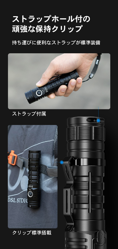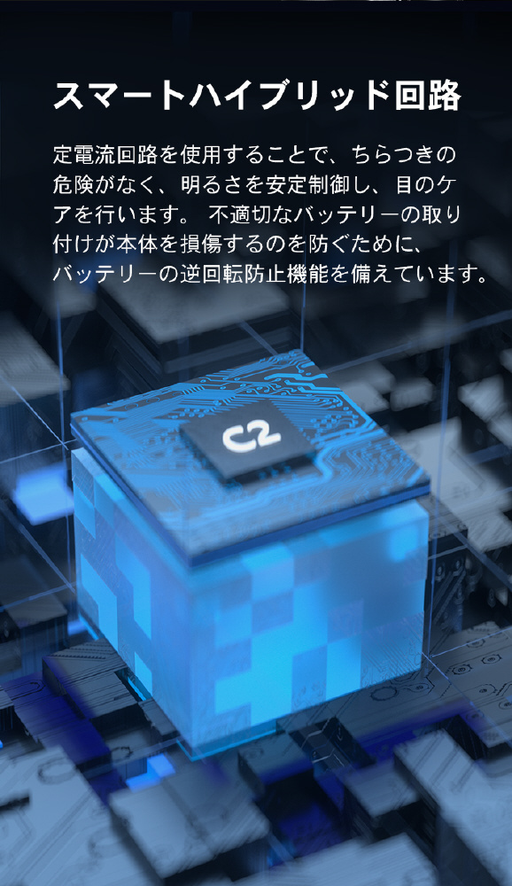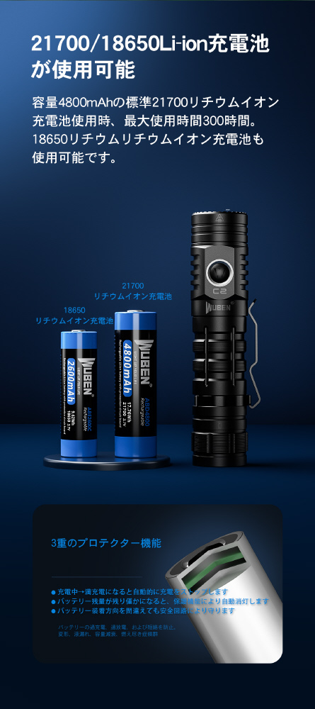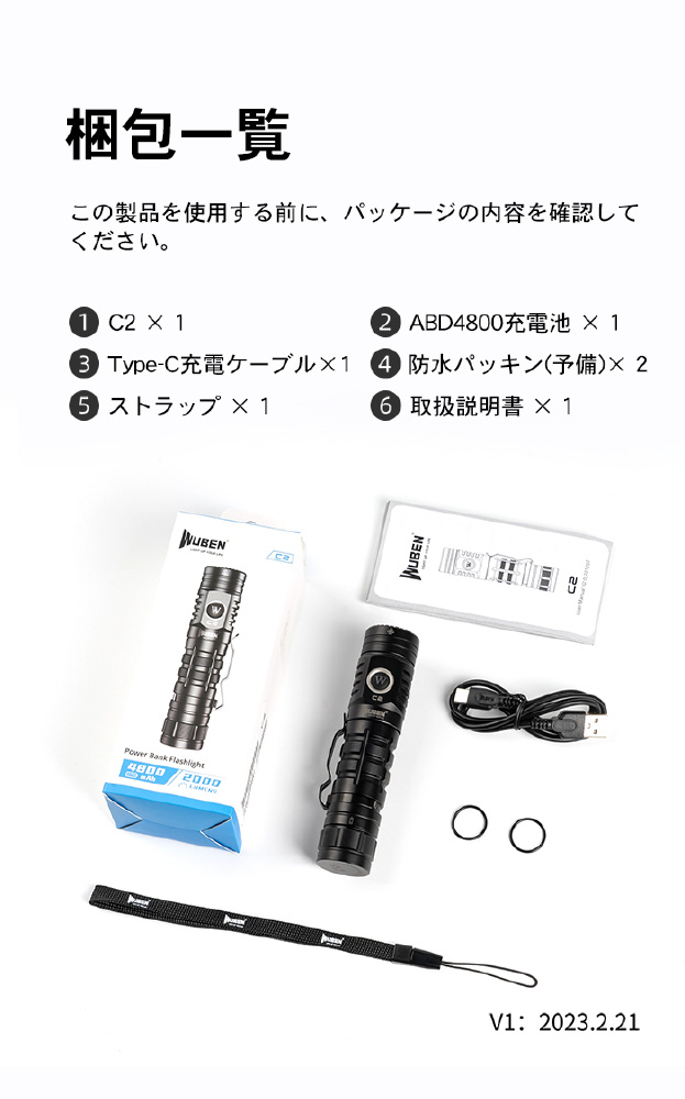 | 付属品 | ・C2本体 × 1 ・ABD4800(21700リチウムイオン充電池)× 1 ・ストラップ × 1 ・防水パッキン(スペア) × 2 ・Type-C充電ケーブル × 1 ・取扱説明書/保証書 × 1 |