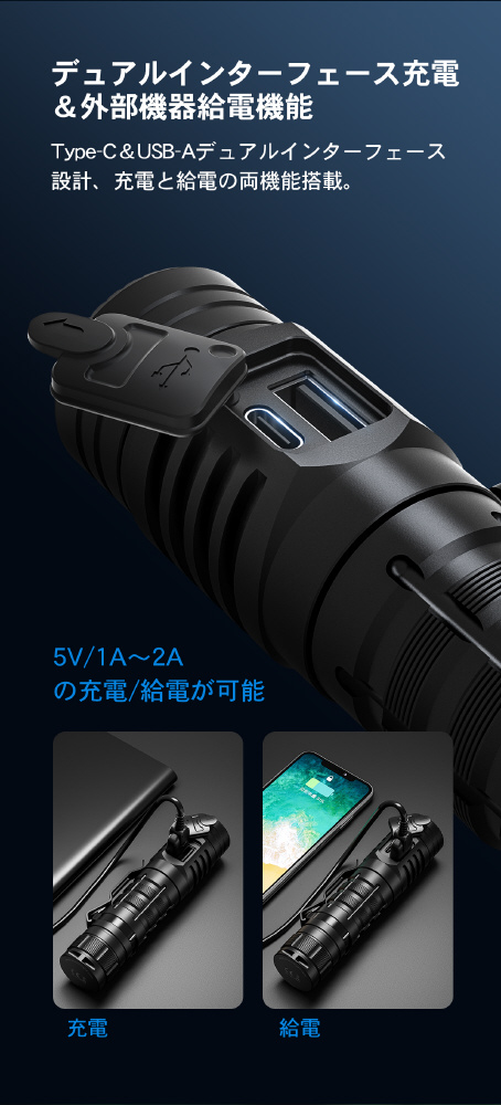 明るさ最大2000ルーメン。給電機能搭載でモバイルバッテリーとして使用可能。