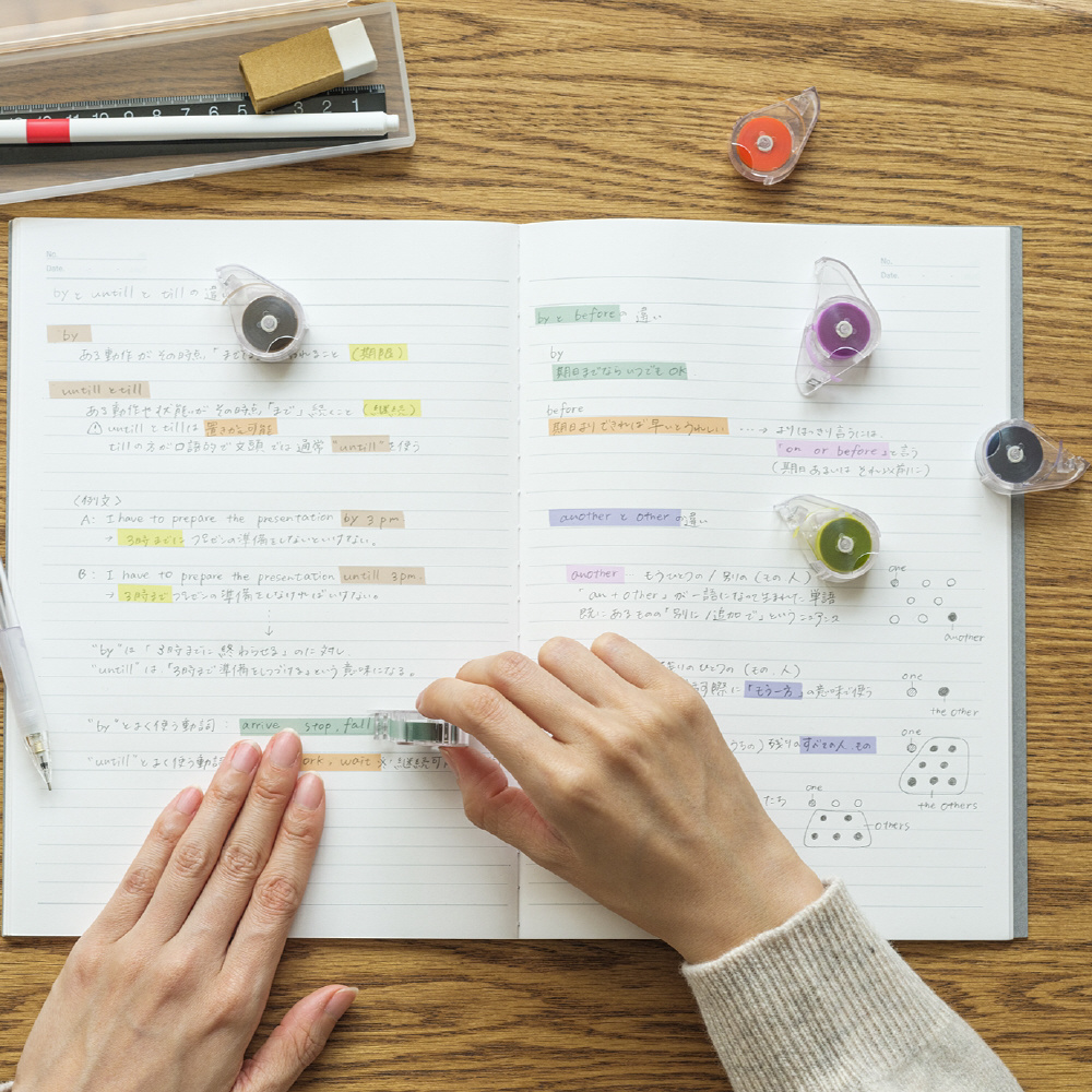 フィルムテープ式のラインマーカーは、インク式のラインマーカーを使用するうえでの悩みとして多い「手や紙面へのインク汚れ」「色むらや下の文字のにじみ」「裏移り/裏抜け」などが起きず、