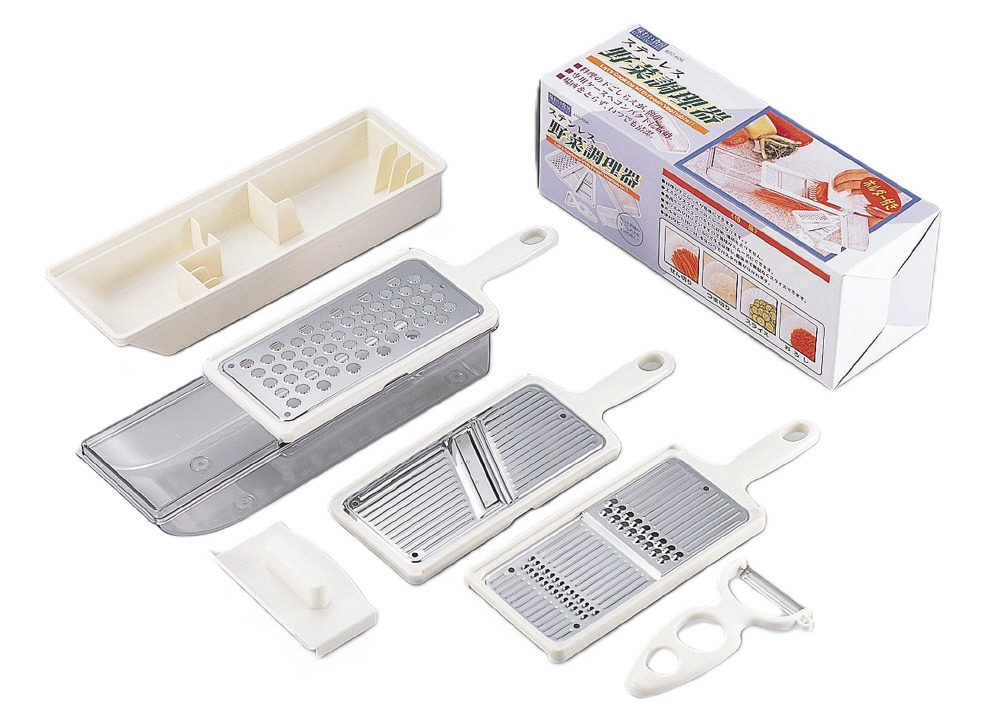 おろし、スライス、千切りなど野菜調理に便利なステンレス製調理器。