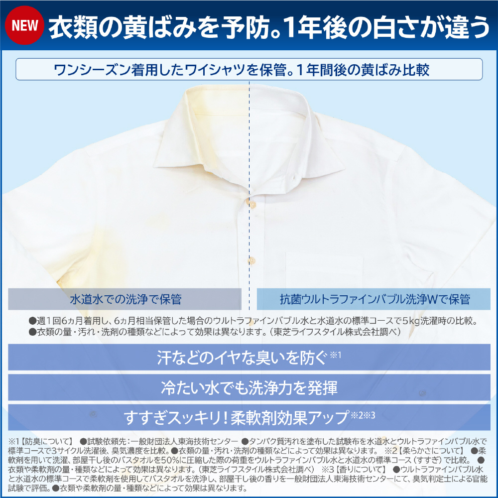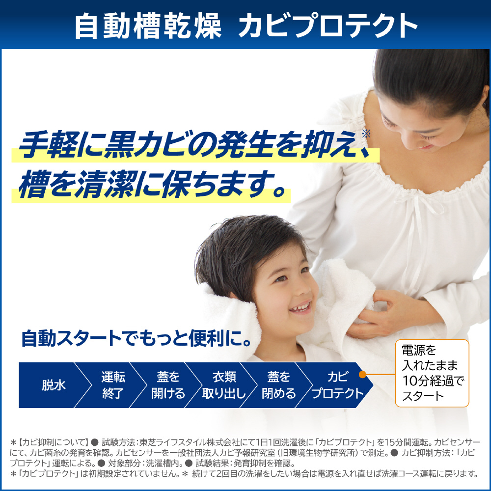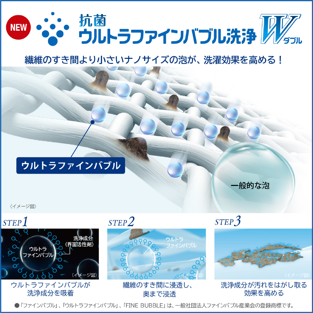 抗菌ウルトラファインバブル洗浄W搭載のコンパクトなタテ型洗濯乾燥機。温か洗いコースで繊維の奥に入り込んだガンコな汚れをキレイに落とします。