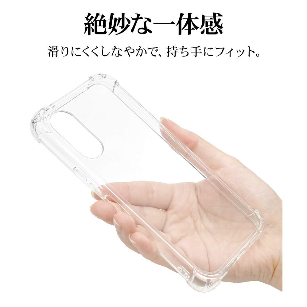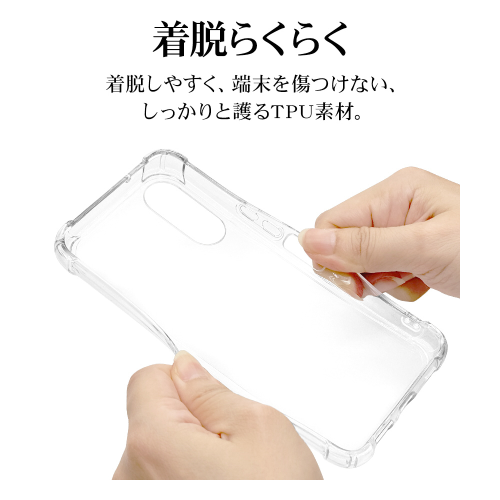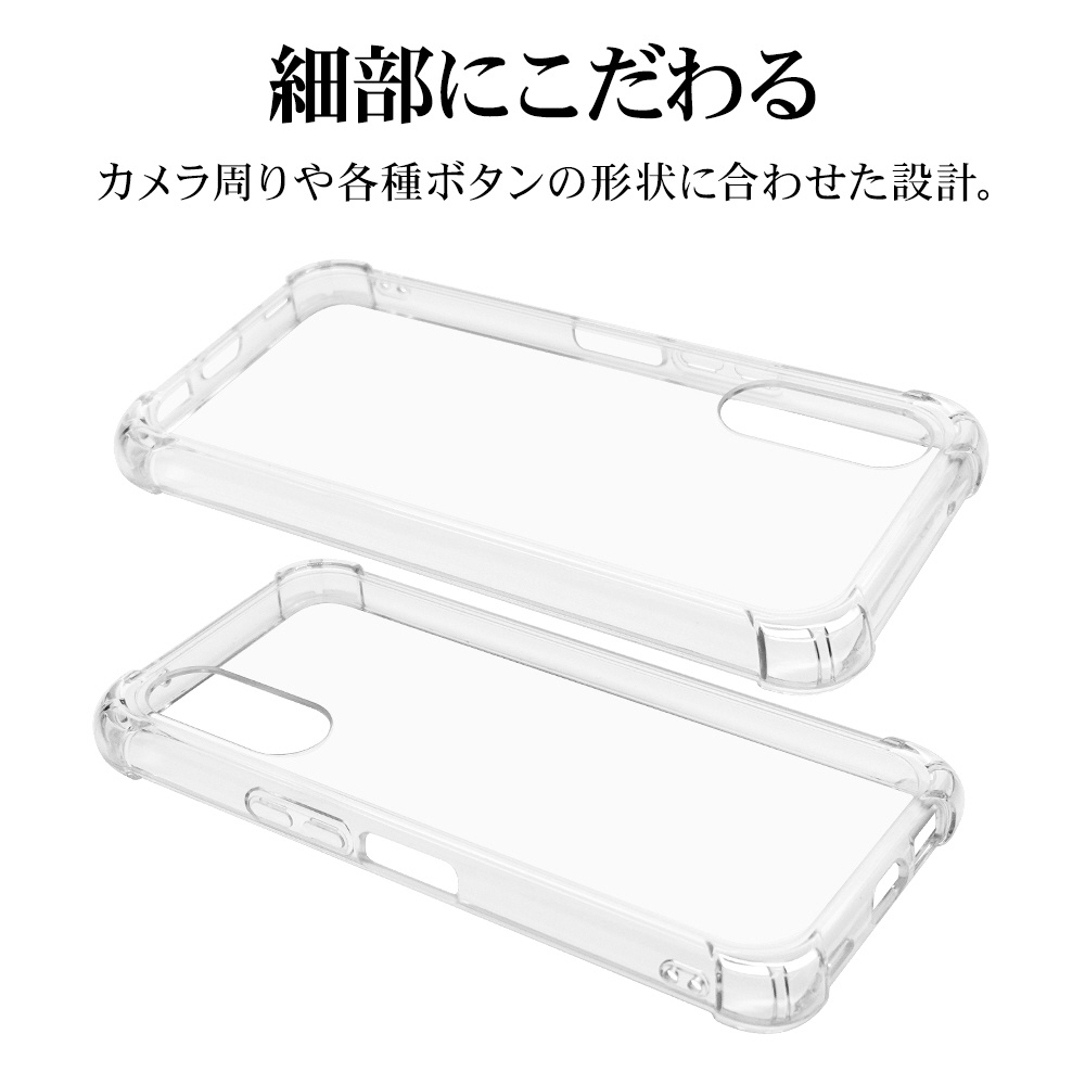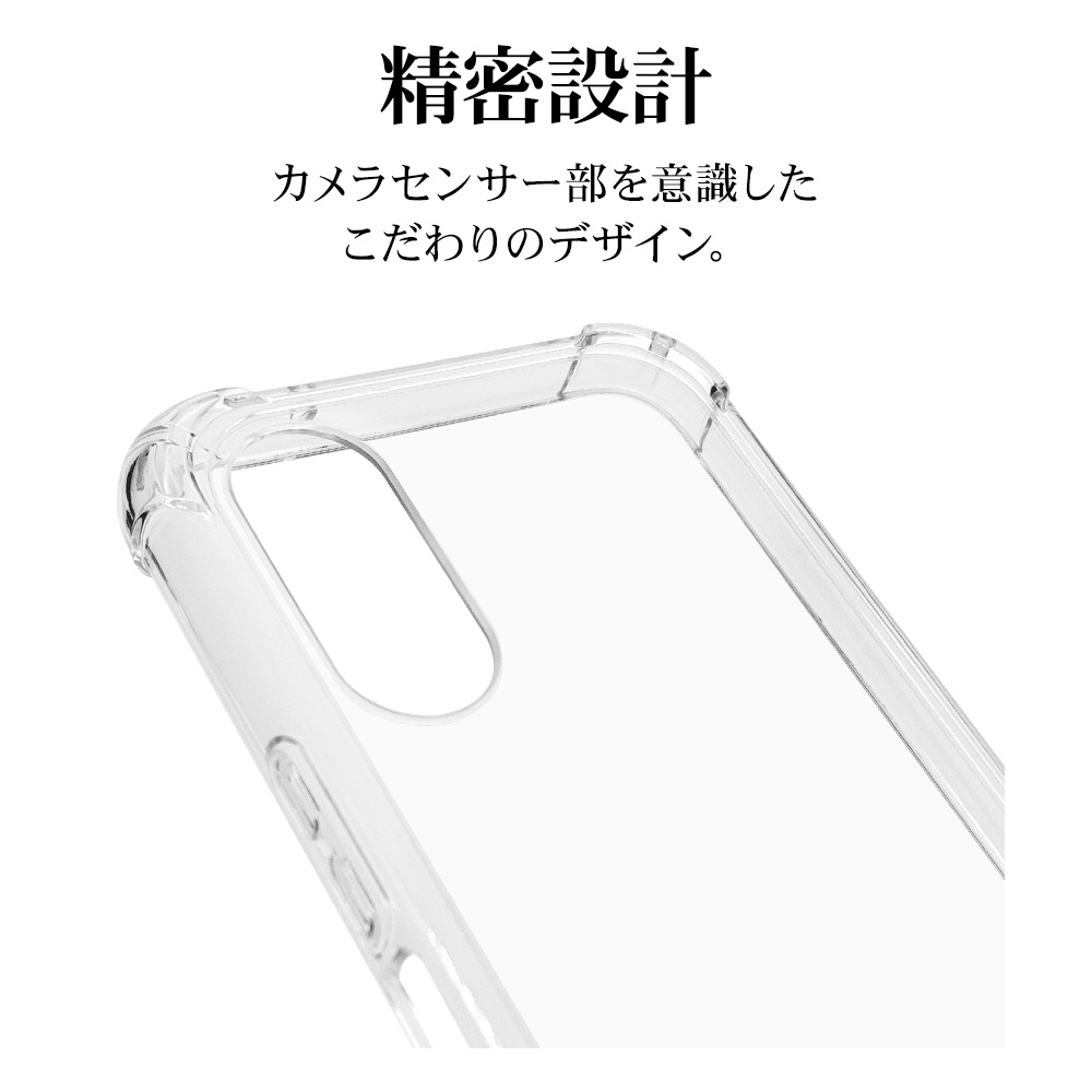 本製品は四隅の空気層が衝撃から端末を護るハイブリッド背面ケースです。側面は弾力と柔軟性を兼ね備えたTPU素材で端末を衝撃から保護。背面は傷に強いポリカーボネート素材を使用しています。※衝撃吸収については、一般的なポリカーボネート製ケースと比較した自社検証結果で、無破損、無故障を保証するものではありません。保護性能と装着感を追求した約1.5mmの厚めのデザイン。側面にやわらかい素材を使用しているため着脱が簡単です。チャーム等を取り付けることが可能なストラップホール付き。※本製品のストラップホールを使用する場合は、ストラップのみで宙吊りにするご使用方法はお止めください。 ケースから機器本体が外れて落下し破損や損傷等の原因となります。ケースを装着したままカメラ機能や充電コネクターの接続、タッチパネル操作が可能です。また各種ボタンの操作も使用可能です。画面を伏せて置いてもディスプレイが直接当たりにくい形状です。※本製品は液晶ガラスの外周まで覆う形状の為、保護フィルム等の形状によっては浮く、もしくは剥がれてしまう場合があります。対応ガラス・フィルムをご使用の際はご注意ください。