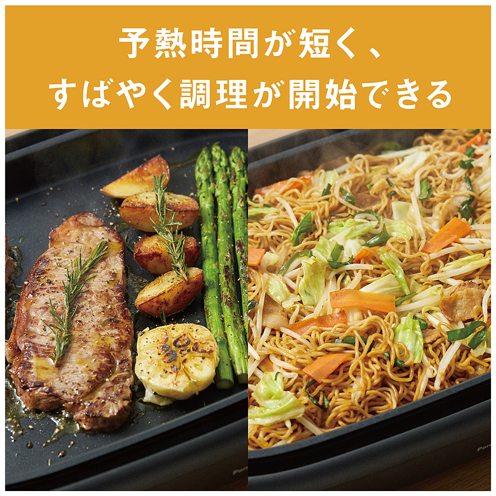 プレート×ヒーター×W数制御の最適設計で、予熱時間が当社従来品に対して約30%※短く、焼きムラを抑えて加熱。