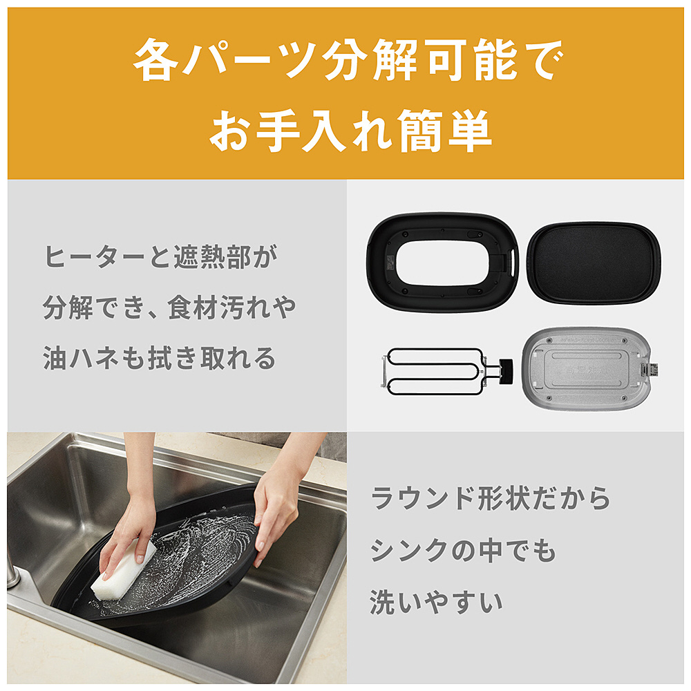 油がたまりやすい遮熱板もヒーターと分離できるので、食材汚れや油ハネもキレイに拭き取れて、いつも清潔に保てます。