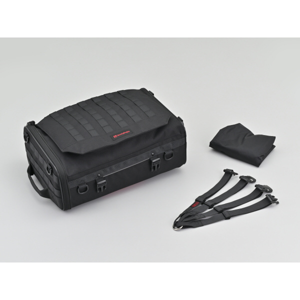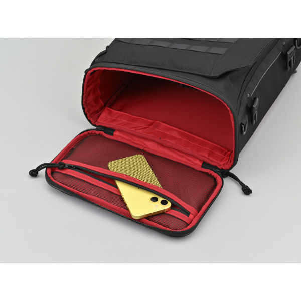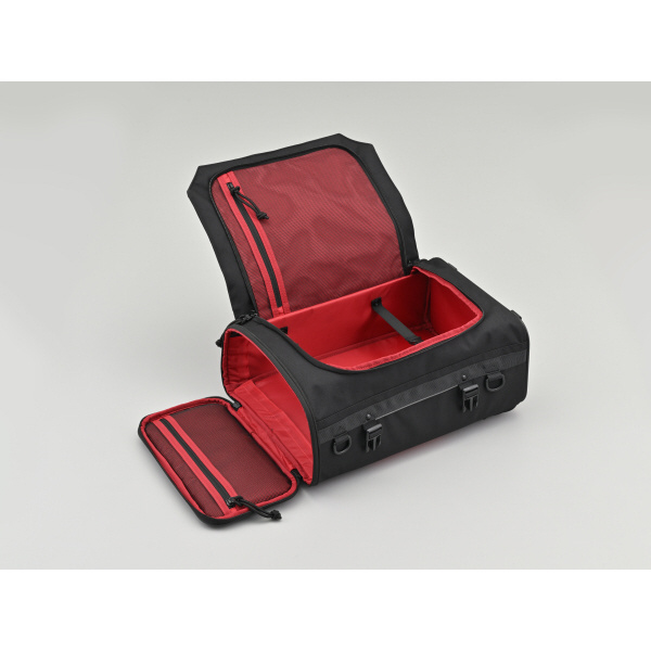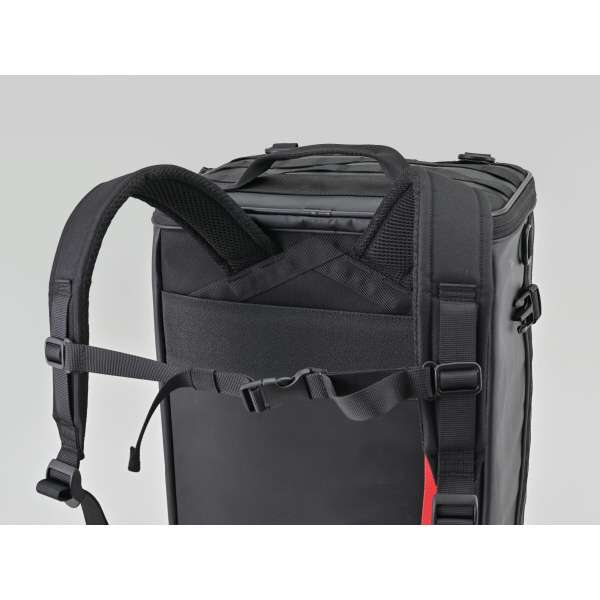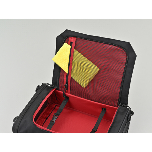 トップとサイドの2か所が大きく開くので、シートバッグとしてもバックパックとしても使いやすいと好評の2WAYシートバッグをリニューアル。