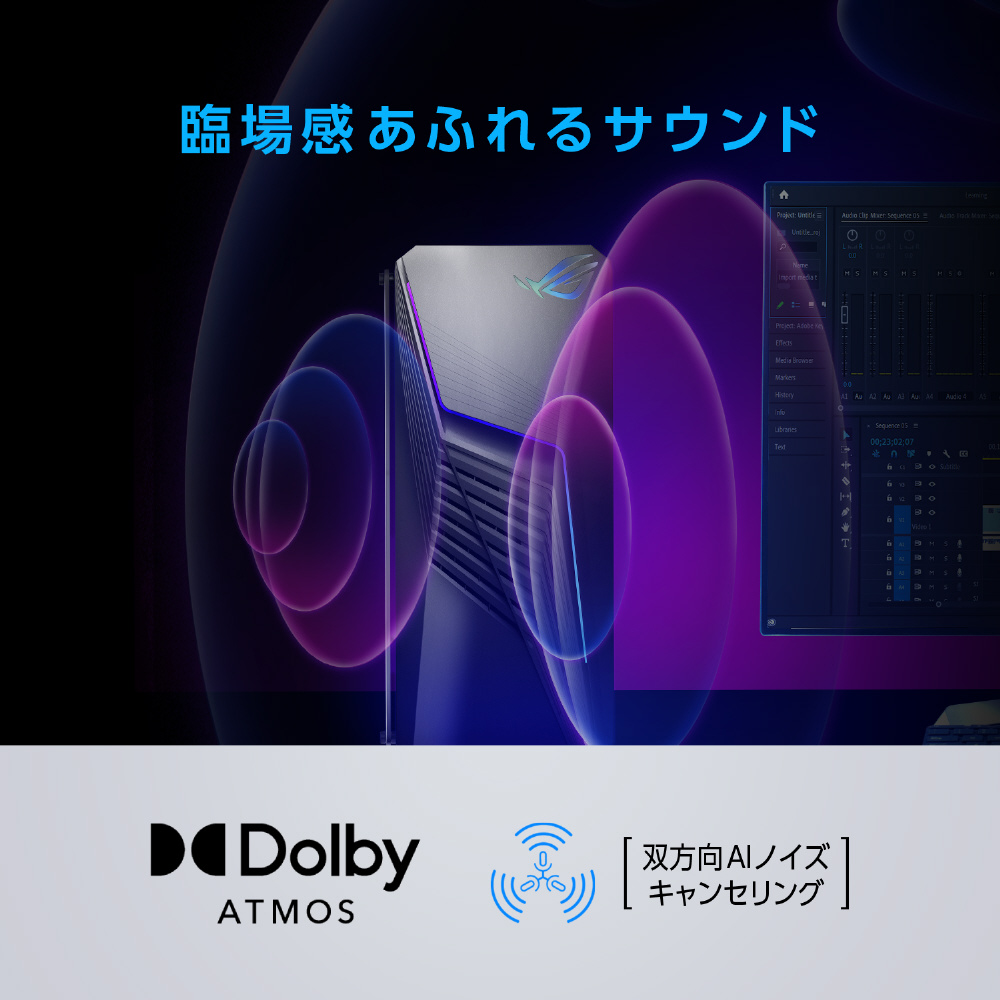 Dolby Atmos対応ステレオスピーカーやヘッドセット機器を接続すれば、臨場感あふれるゲームサウンドを体験できます。さらに、双方向AIノイズキャンセリング技術によって、周囲のノイズを軽減し、音声通話をクリアに楽しむことができます。