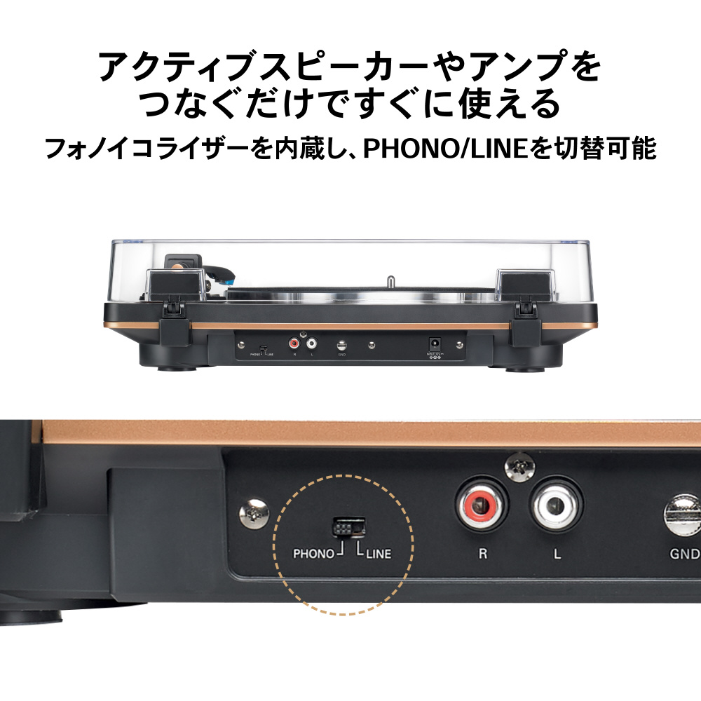 オーディオテクニカ伝統のJ字型トーンアームに⼀体化された、0.6mil接合丸針のカートリッジ AT-VM95Cを付属し、優れたチャンネル・セパレーションと低歪みにより、卓越した再⽣クオリティを実現します。また、交換針は AT-VM95シリーズのE(接合楕円針)、EN(無垢楕円針)、ML(マイクロリニア針)、SH(シバタ針)にアップグレード可能。33回転と45回転のレコードを再⽣でき、ワイヤレス接続だけでなく、有線接続でも、お持ちのアクティブスピーカーやアンプに接続することができます。