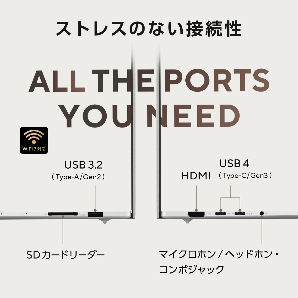 | インターフェイス | [外部ディスプレイ出力]HDMI×1、Type-C×2 [USBポート]USB4 (Type-C/Power Delivery対応) ※×2、USB3.2 (Type-A/Gen2) ×1 ※データ転送と映像出力、本機への給電をサポートしています。すべてのデバイスの動作を保証するものではありません。 [カードリーダー]SDXCメモリーカード、SDHCメモリーカード、SDメモリーカード [オーディオ]マイクロホン/ヘッドホン・コンボジャック×1 |