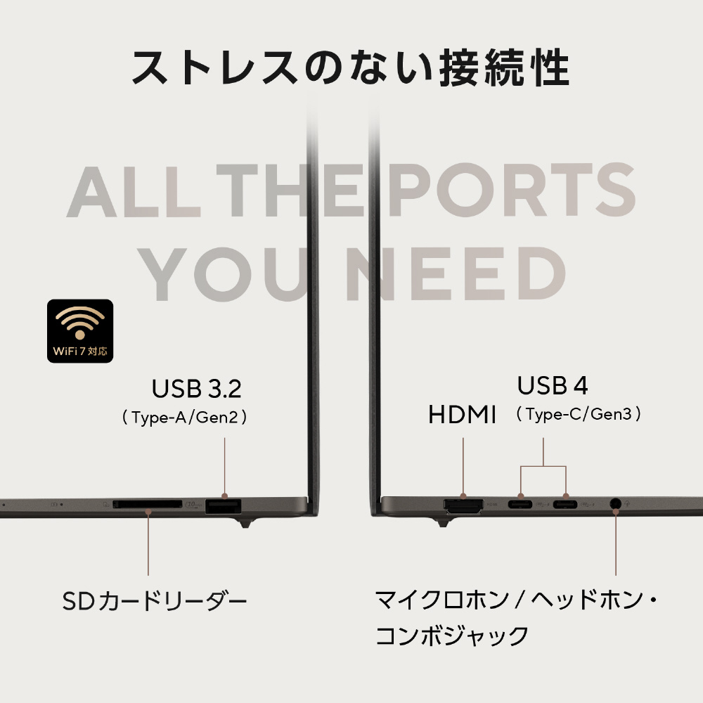 スリムなボディに汎用性の高いUSB4 (Type-C/Power Delivery対応)、USB 3.2、HDMI、SDカードリーダーといった豊富なインターフェースを搭載。どこにいても生産性を損ないません。