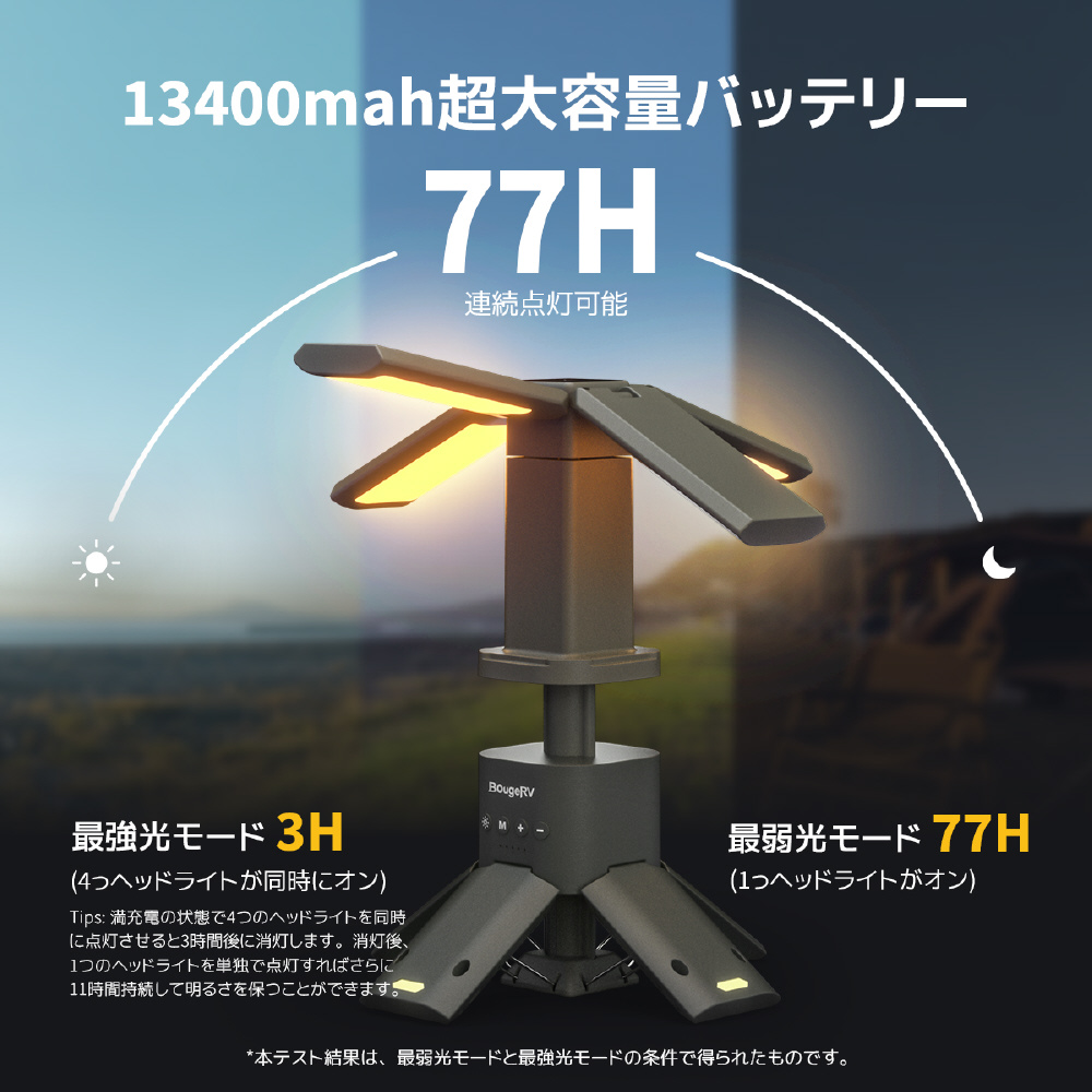 また、13400mAhの大容量バッテリーを内蔵しており、最長77時間の連続照明が可能です。