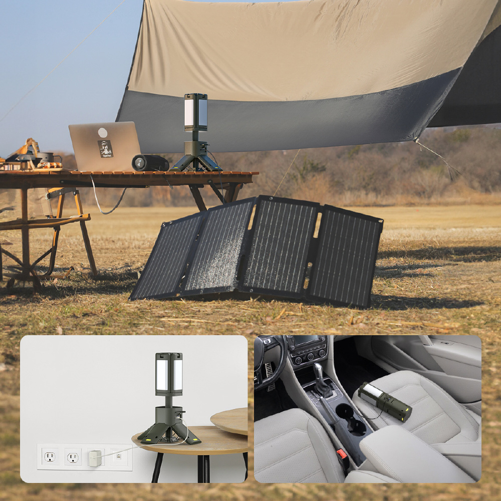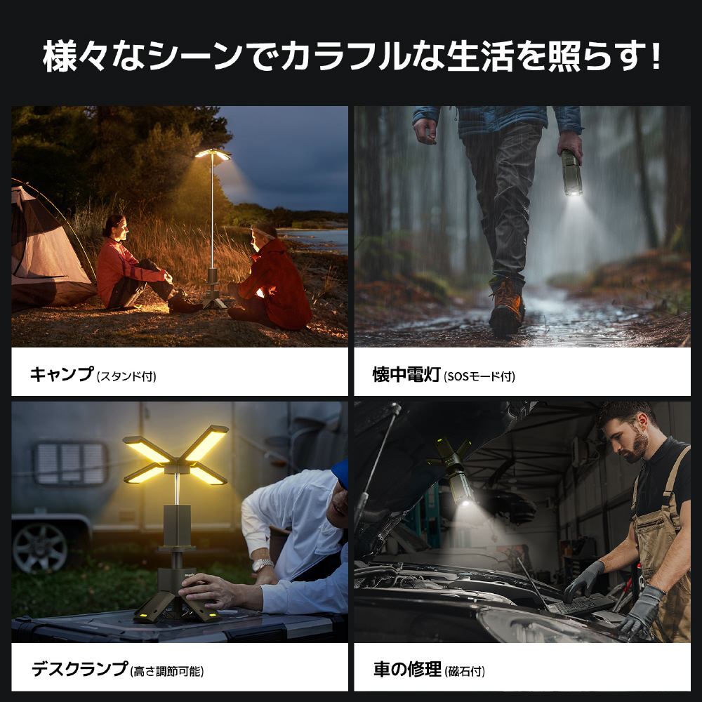 持ち運びが簡単で、さまざまなシーンで活用できます。折りたためば懐中電灯として使用でき、スタンドを展開すればスタンドライトとして利用可能です。