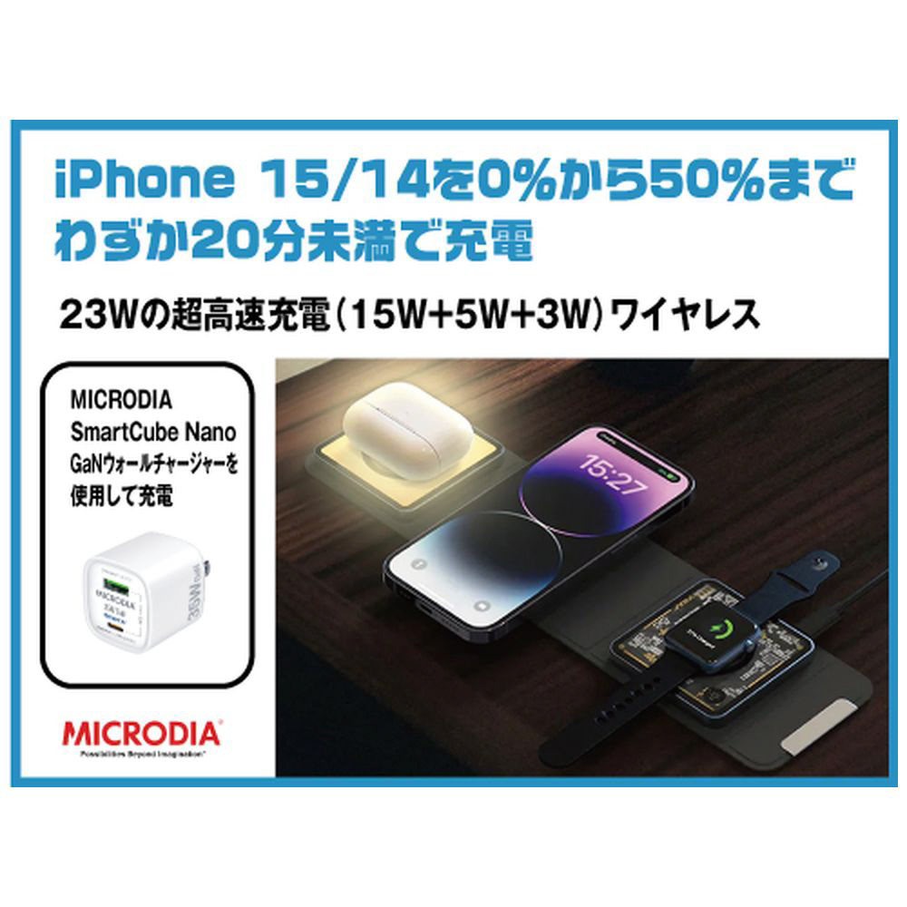 iPhone、Apple Watch、AirPodsが同時に充電されているときでも23Wの全出力を提供。
