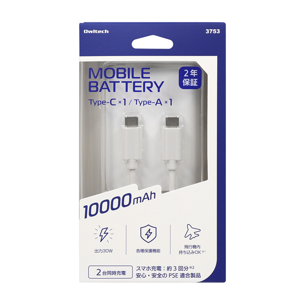 モバイルバッテリー 10000mAh PD30W USB Type-C入出力/USB Type-A出力 ホワイト OWL-LPB10020-WH [2ポート]