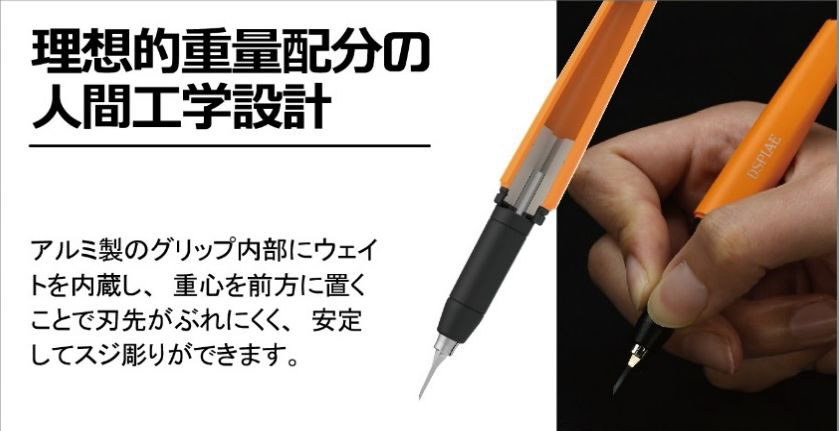 アルミ製のグリップ内部にウェイトを内蔵し、重心を前方に置くことで刃先がブレにくく、安定してスジ彫りができます。