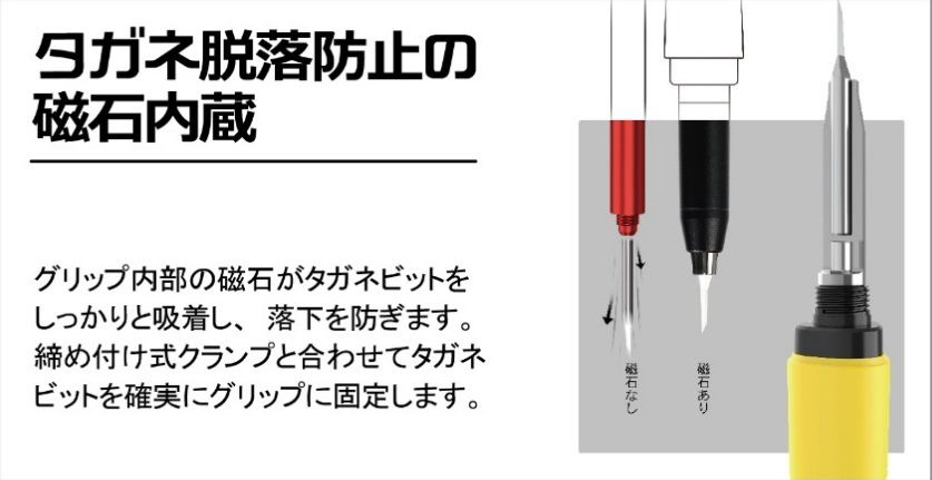 グリップ内部の磁石がタガネビットと吸着し、落下を防ぎます。締め付けクランプと合わせてビットを確実に固定します。